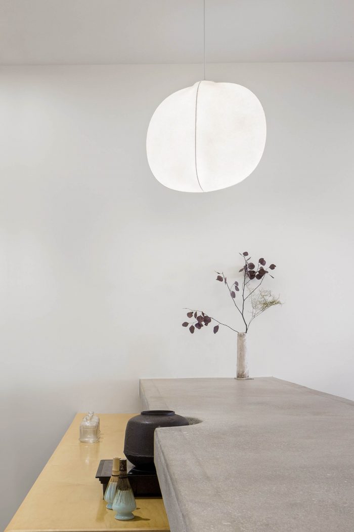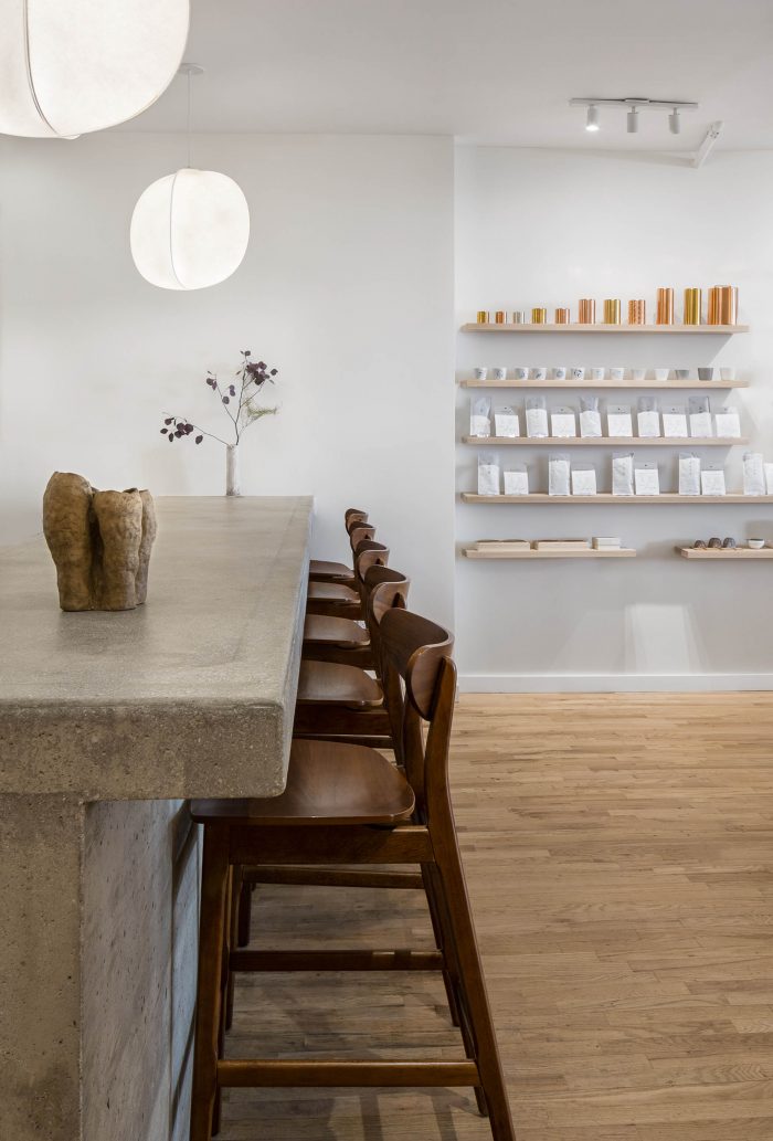 咖啡馆的设计灵感来自于日本的仪式性茶馆,并通过现代材料的视角加以想象。在外墙,一个新的枫树和玻璃服务窗口欢迎来自街道的游客。周围的白色灰泥立面将客人引入一个明亮和温暖的内部。一进门,客人的视线就被引向空间后部的一个14英尺(426厘米)的现浇混凝土酒吧。吧台台面上的一个凹陷的切口放置了一个热气腾腾的茶壶,并设置了一个重要的茶水服务的焦点。