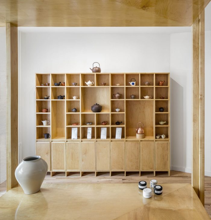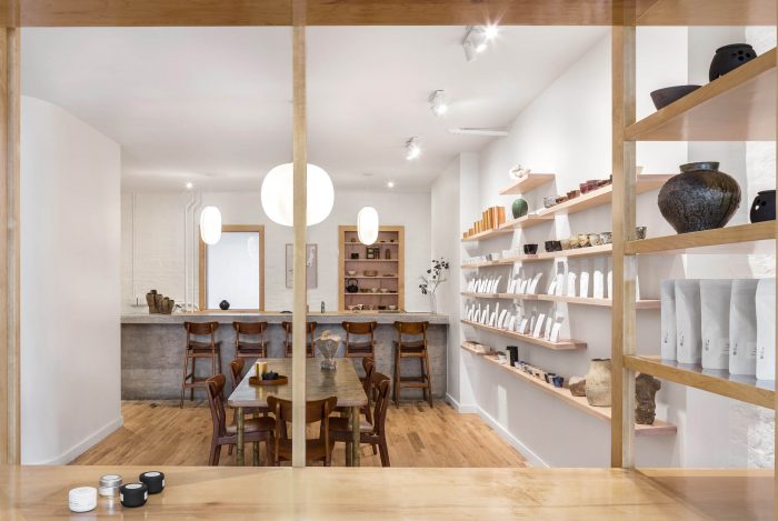 At the center of the café sits a custom maple table with seating where guests can sit together and enjoy tea and a selection of matcha treats. The walls of the café are filled with museum-quality ceramics on floating shelves and illuminated cupboards. Guests are presented with a full-height maple latticework as they checkout.