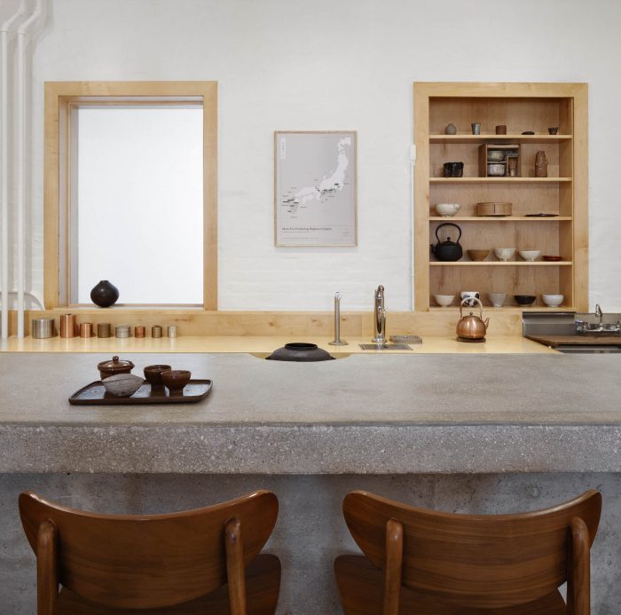 The design of the café was inspired by the ceremonial tea structures of Japan imagined through a modern lens of materials. At the façade, a new maple and glass service window welcome visitors from the street. The surrounding white stucco façade introduces the guests to a bright and warm interior. Upon entry, the guest’s view is directed toward a monumental 14 foot (426 cm) cast in place concrete bar at the rear of the space. A recessed cut-out in the bar countertop holds a steaming tea kettle and sets up an important focus of the tea service.