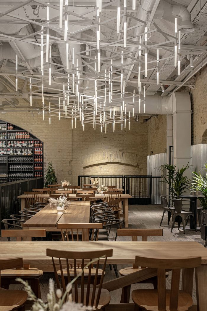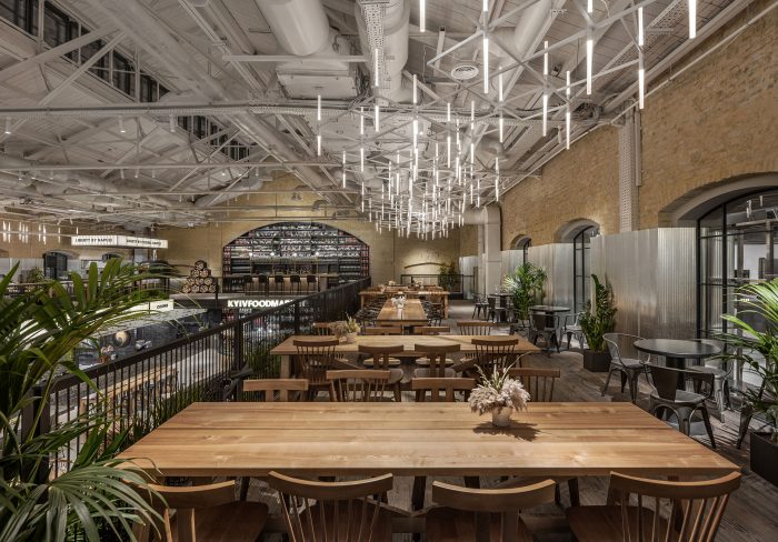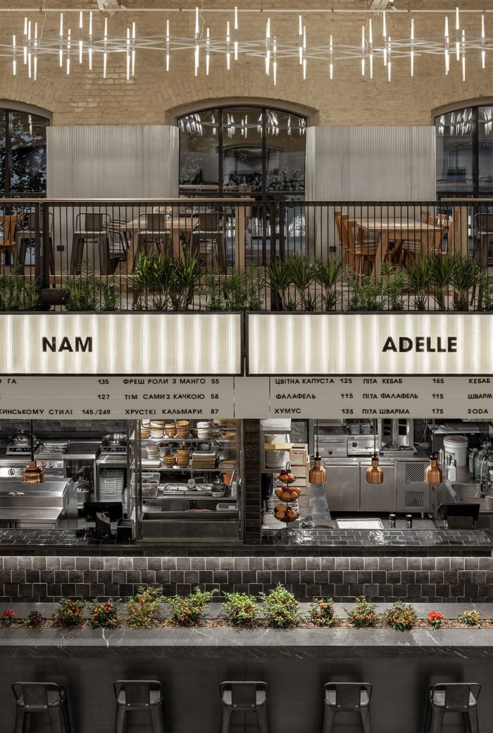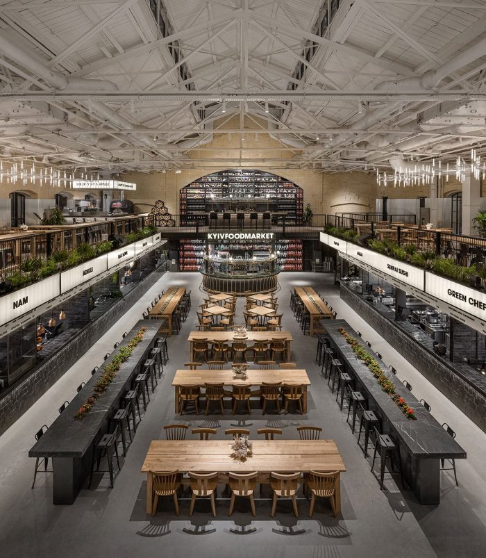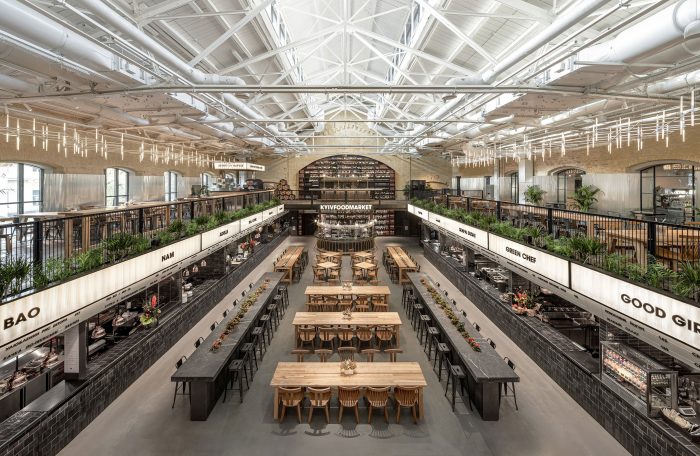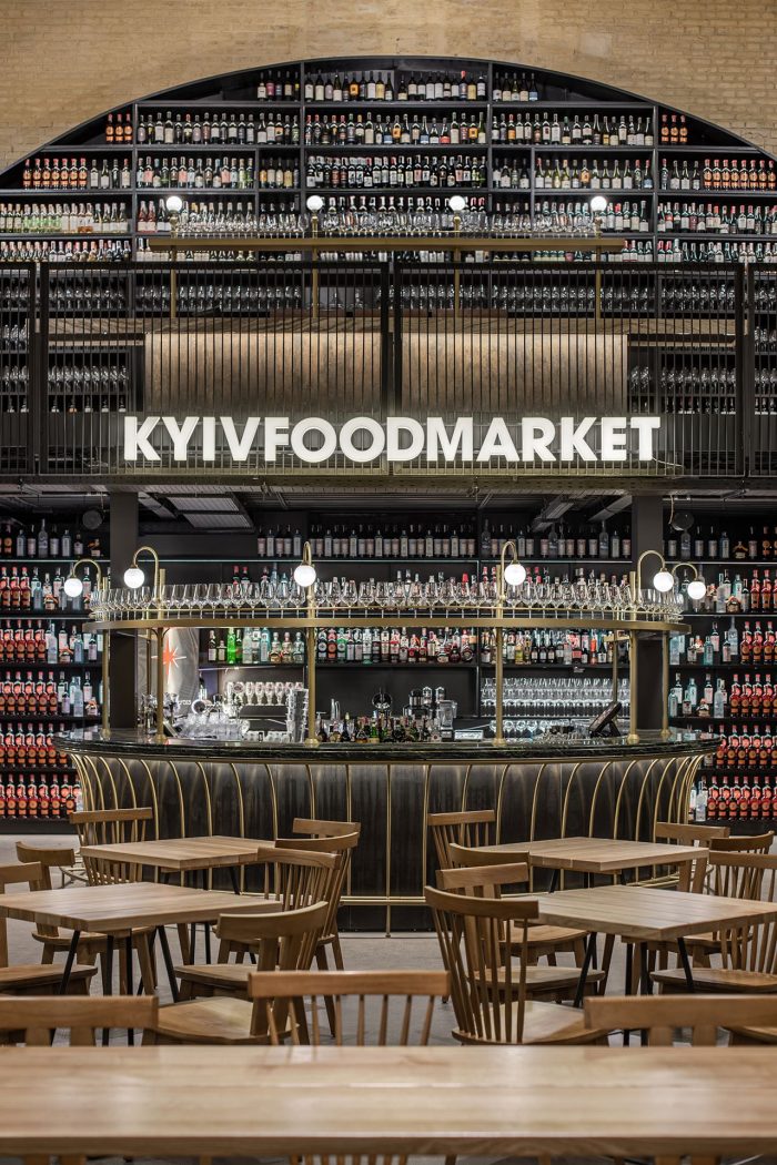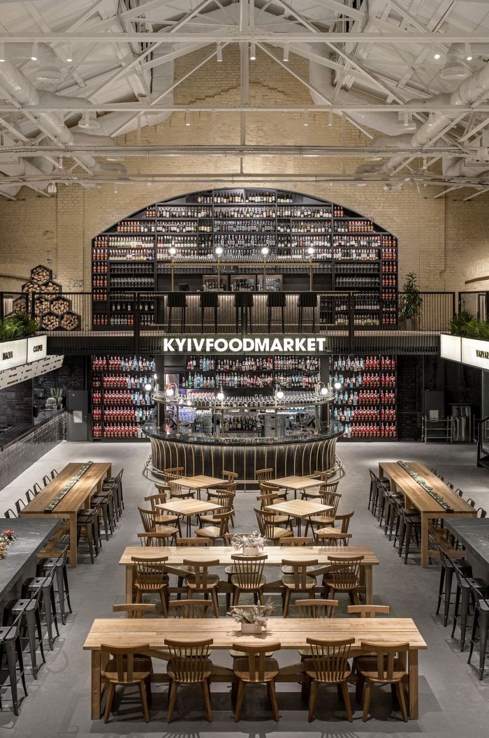基辅食品市场由敖德萨的餐馆老板亚历克斯·库珀(Alex Cooper)和基辅的餐馆老板米哈伊尔·贝林(Mikhail Beilin)共同创立,在一个屋顶下汇集了20多家餐厅和酒吧,库珀说这是一个社交场所,与典型的餐馆相比,“人们可以戴着眼镜走动,分享食物并与陌生人聊天”。为此,中庭式大厅中央的就餐区由紧凑的公共桌和吧台组成,鼓励社交和融合。中央餐厅区被自然采光所包围,被宽阔的天窗所环绕,被认为是真正的公共空间,而在夹层楼,更宽的桌子则提供了更多的亲密感。