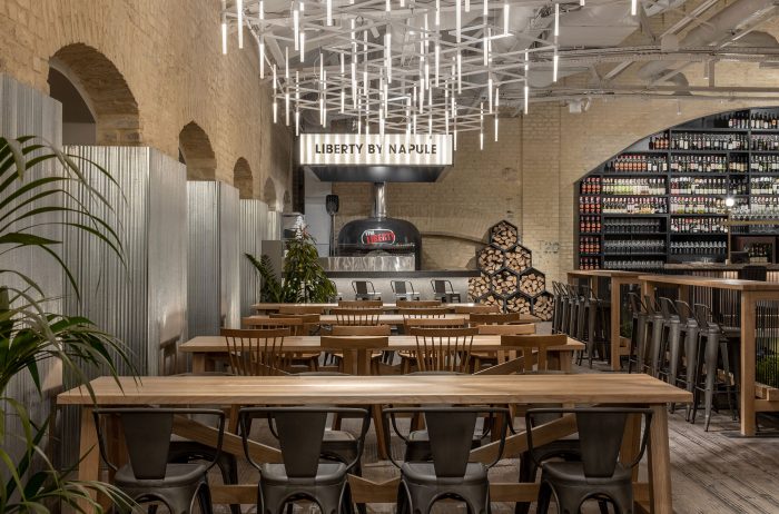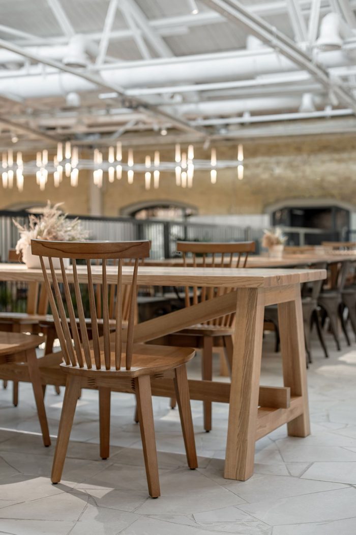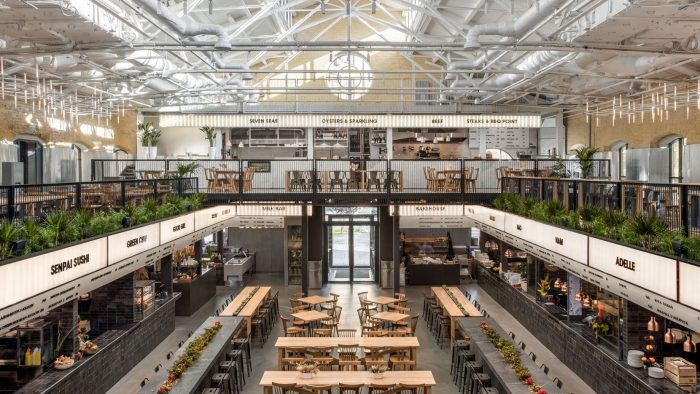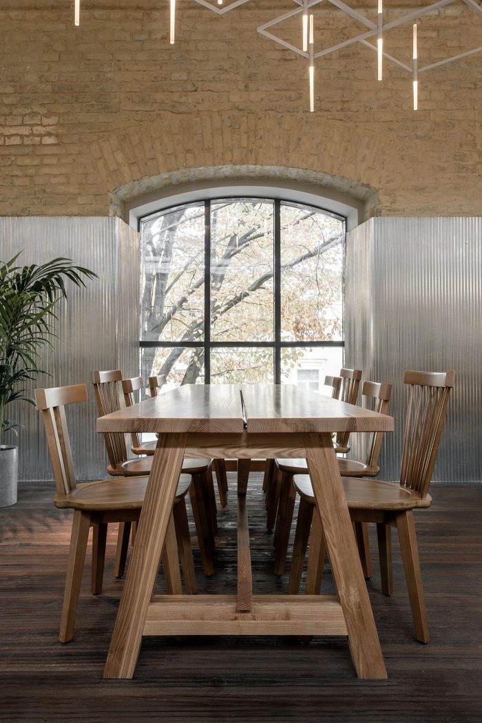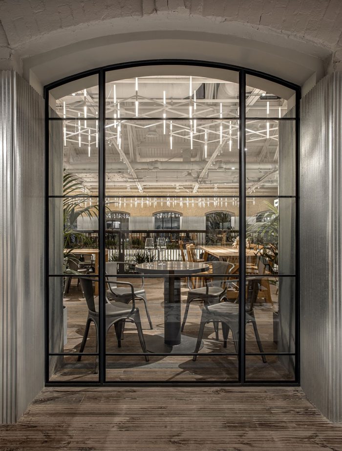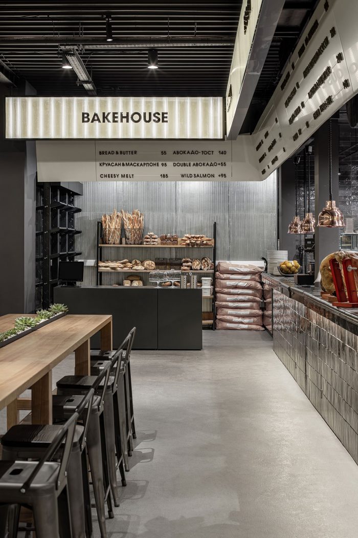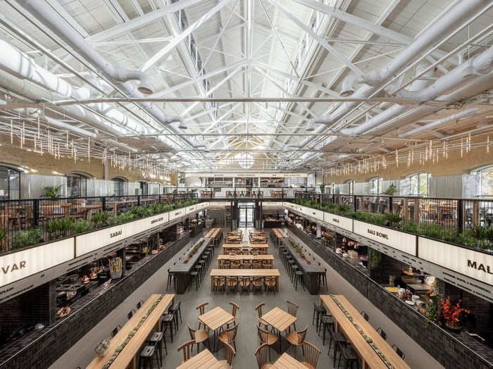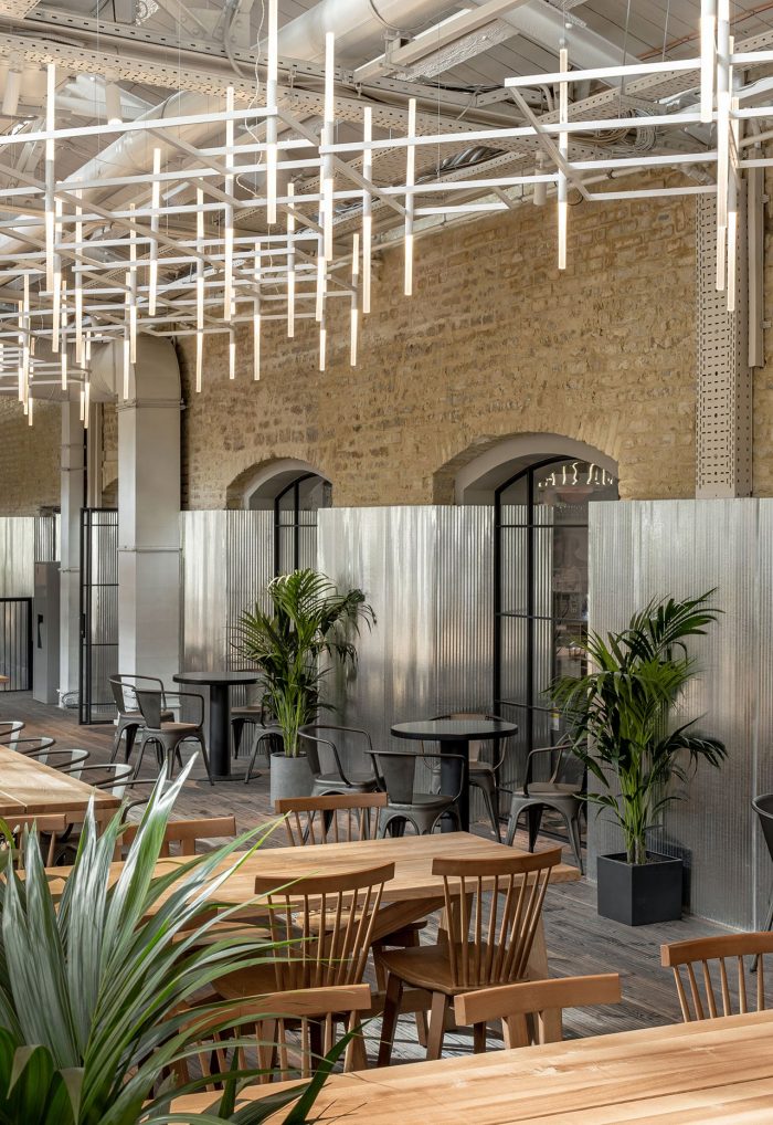 基辅食品市场由敖德萨的餐馆老板亚历克斯·库珀(Alex Cooper)和基辅的餐馆老板米哈伊尔·贝林(Mikhail Beilin)共同创立,在一个屋顶下汇集了20多家餐厅和酒吧,库珀说这是一个社交场所,与典型的餐馆相比,“人们可以戴着眼镜走动,分享食物并与陌生人聊天”。为此,中庭式大厅中央的就餐区由紧凑的公共桌和吧台组成,鼓励社交和融合。中央餐厅区被自然采光所包围,被宽阔的天窗所环绕,被认为是真正的公共空间,而在夹层楼,更宽的桌子则提供了更多的亲密感。