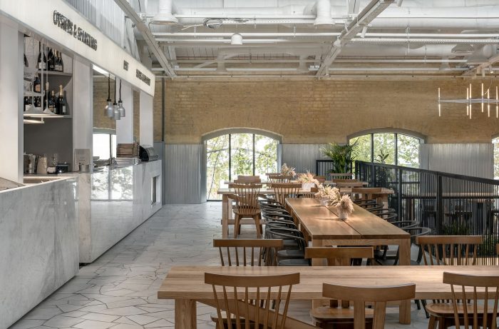 Located in a converted 18th century arsenal in Ukraine’s capital, Kyiv Food Market is a bustling, modern culinary venue where some of the city’s best restaurants meet under the same roof. Left abandoned for many years, the decrepit centuries-old building has been thoroughly renovated by interior architects balbek bureau who have married its original industrial character with a contemporary aesthetic of elegant sophistication. Unfolding on two levels, the 2,000-square-metre food hall is centred on a communal dining area, with food counters lining the perimeter, above which a mezzanine floor features additional dining tables, a show kitchen used for master classes or presentations, and an eye-catching bar showcasing a grandiose wine and liquor display.