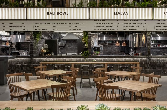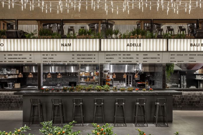 Kyiv Food Market brings together more than 20 restaurants and bars under one roof, conceived as Cooper says as a social place where, in contrast to typical eateries, “people can walk around with glasses, share food and talk with strangers”. To this end, the dining area at the centre of the atrium-like hall consists of tightly packed communal tables and bar counters that encourage socializing and mingling. Swathed in natural light courtesy of the large skylights, the central dining zone has been conceived as a true public space, while on the mezzanine level, more widely spaced tables offer more intimacy.