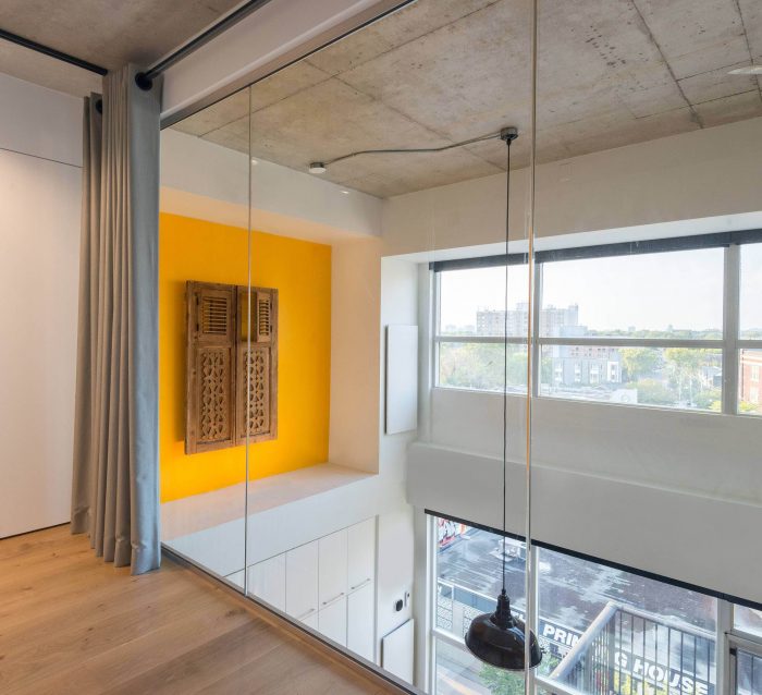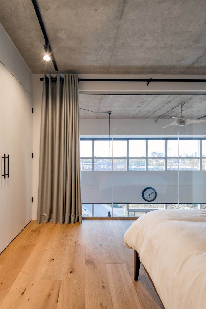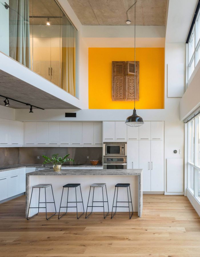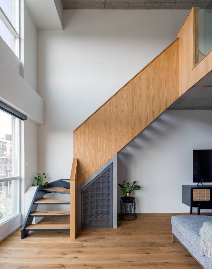 The two levels are connected using an existing stair refinished with black metal treads and a continuous stained oak guard that terminates at the floor-to-ceiling window of the master bedroom. This simple material palette juxtaposes the airy white walls and exposed concrete ceilings to create an intimate yet robust presence. Out of budget and environmental considerations, many elements of the loft were refurbished and reused. This included keeping closet shelving, track lighting, along with kitchen cabinets, counters, and appliances. Simple updates were made to the kitchen including new flooring and a yellow-painted niche wall to add a splash of playfulness in an otherwise muted colour scheme.