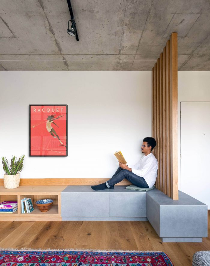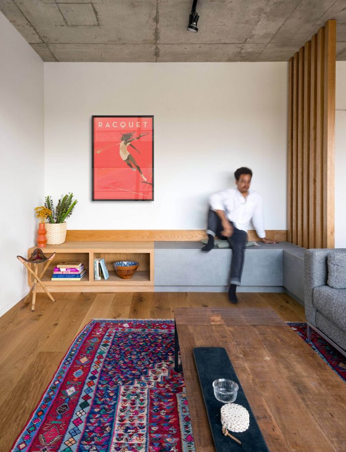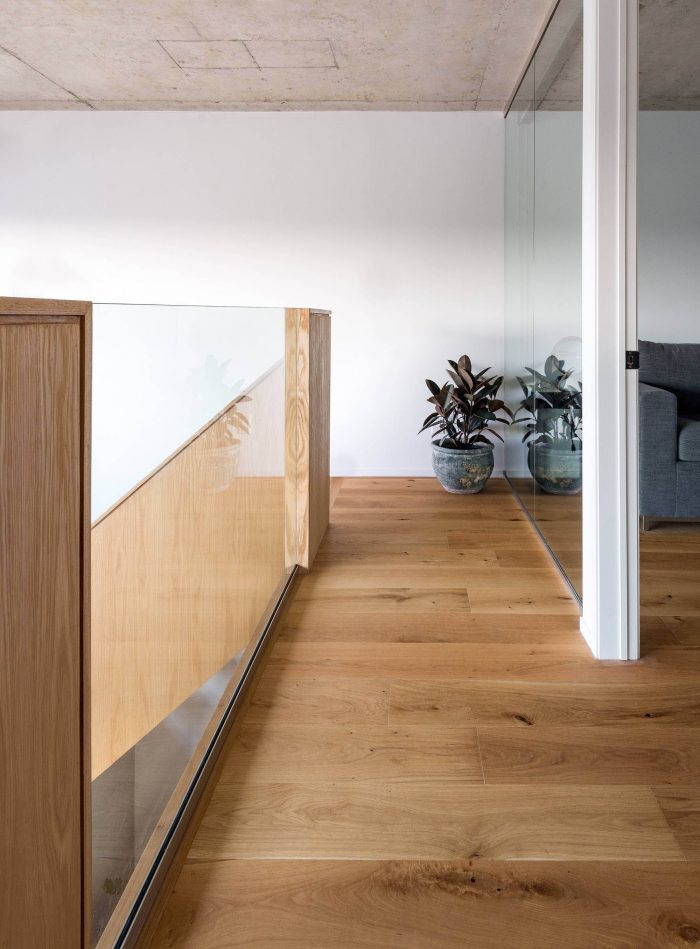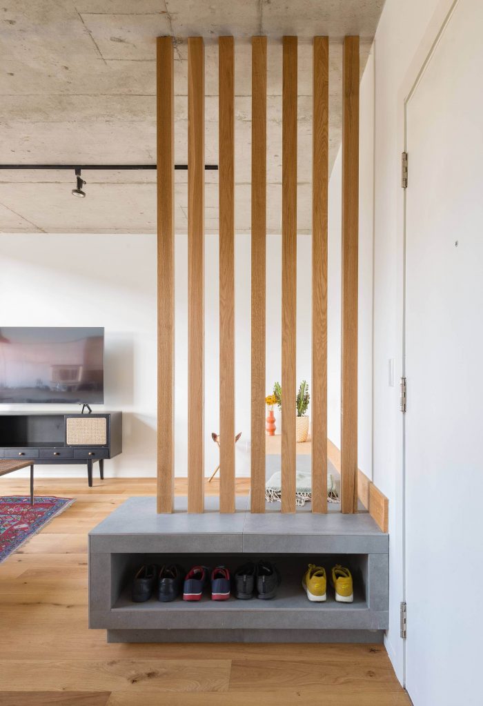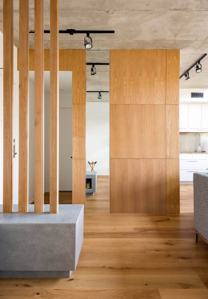 作为一个小阁楼,重要的是,特色设计元素既能定义空间,又能发挥多种功能。其中一个例子是客厅的长椅,它在提供座位的同时,也是通往入户门和化妆室的隐私屏风。此外,L形的长凳上有架子的切口,以容纳更多的鞋子和书籍的空间。同样,橡木墙板也被创造出来,提供质感的表面和全高的入口镜,同时隐藏了一个难看的电气面板。所有这些都强调了简单的手势在创造小空间时的深刻影响。