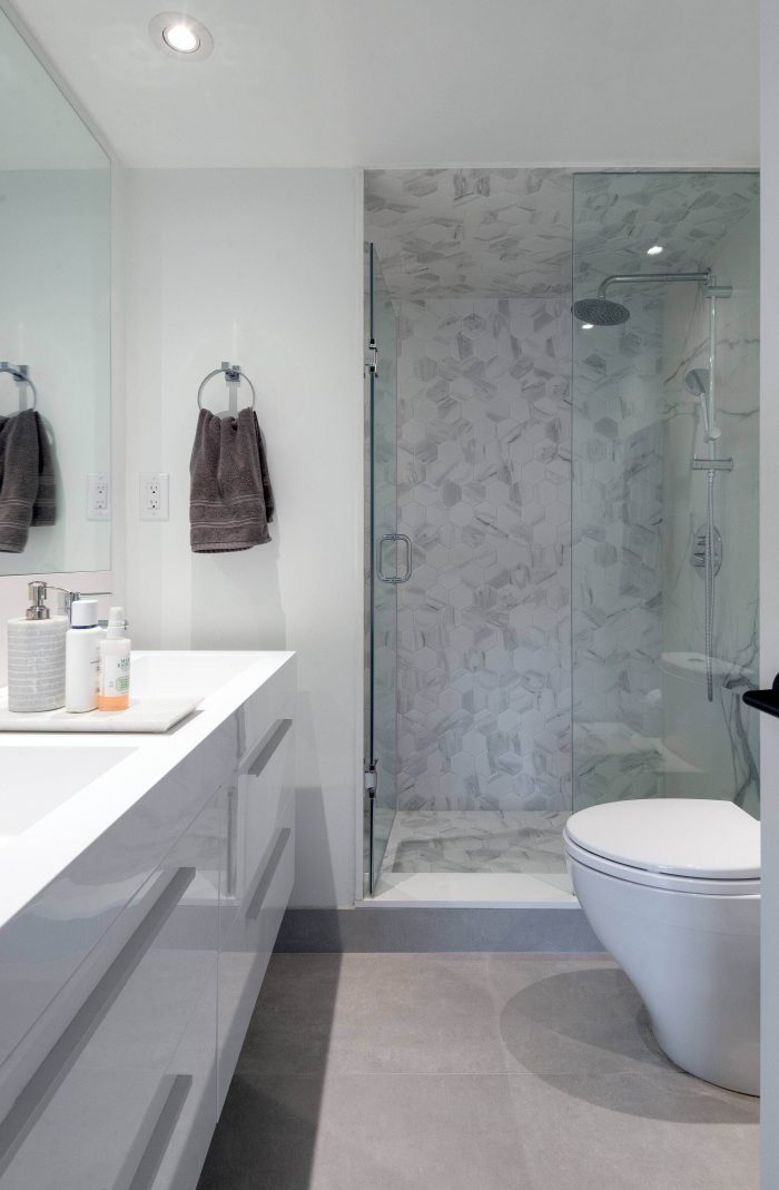 Being a small loft, it was important that feature design elements could both define space and serve multiple functions. One example is the living room bench which provides seating while also acting as a privacy screen to the entry door and powder room. In addition, the L-shaped bench has cut-outs for shelves to accommodate further space for shoes and books. Similarly, an oak wall panel was created to offer a textured finish and full height entry mirror while concealing an unsightly electrical panel. All of these emphasizing the profound impact simple gestures have in the creation of small spaces.