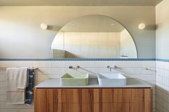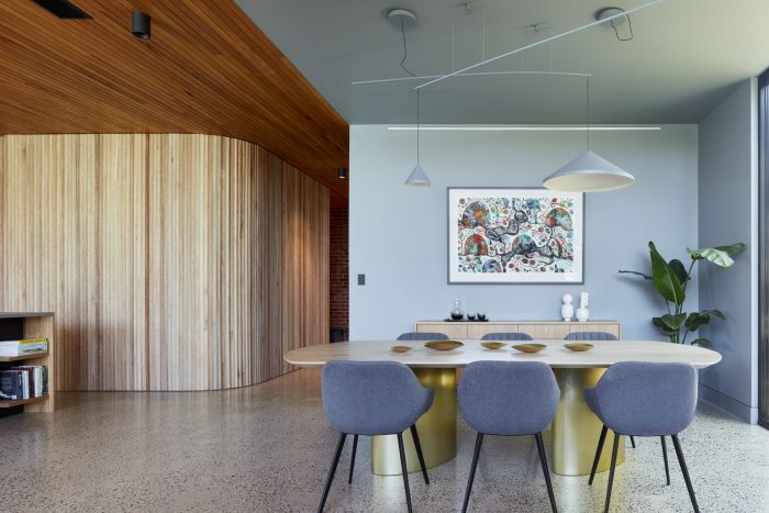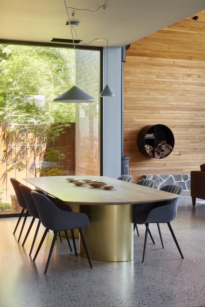 This celebration of materiality and tactility is repeated in the custom design of fixtures and the subtler junctions throughout. The patina of brass counters the warmth of timber in the design of the bespoke dining table as well as towel rails, hooks, doors, joinery handles, mirrors, and vanities. Outside, a playfulness is captured through a circuitous path across the rear lawn framed by raised Corten planters and the slate fire pit. The landscaping has been designed to complement the lifestyle fostered indoors and is reinforced through materials and further textured detailing.