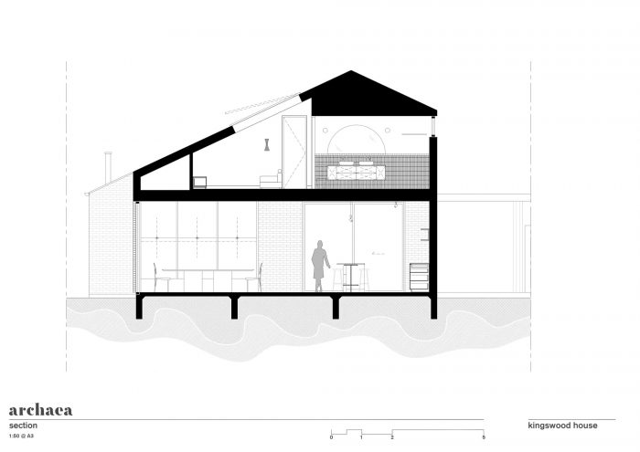 Throughout, the selected palette of material and color is enhanced through its placement and format. Primary paths of circulation are reinforced through the use of material to visually guide one through and into the main spaces which coincide with granting ancillaries appropriate privacy. From the entry, exposed face red brickwork marks the existing fabric with confidence and clarity. The neighboring timber-lined wall traces a gentle curve, leading one around from entry up the stairs or through to the kitchen and dining areas. The free reign of timber over the ceilings is supported and brought to the ground with bold slimline brickwork that encourages the expansive living area to a healthy stretch toward the northern aspect. As the silver top-ash continues out to form a raking eave, its projection both permits and prohibits sunlight seasonally ensuring perennial comfort. An abundance of thermal mass couples with in-slab hydronic heating and cooling.