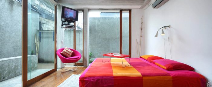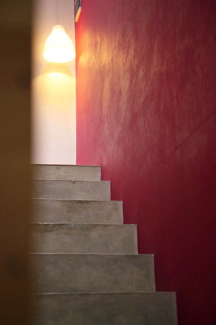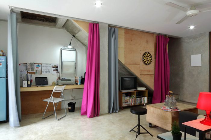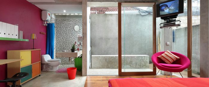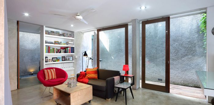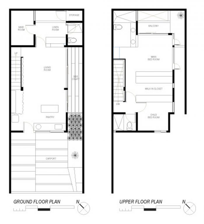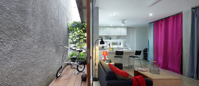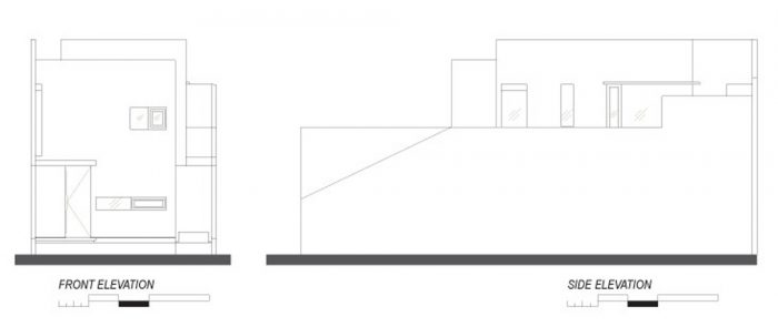 Both levels is bound with a corridor that taken a shape like a sidecourt on the right side of the building. That way, the building looks like it has only 4.65 meter width and leaning to the left. On the side of the sidecourt, there’s an open space.