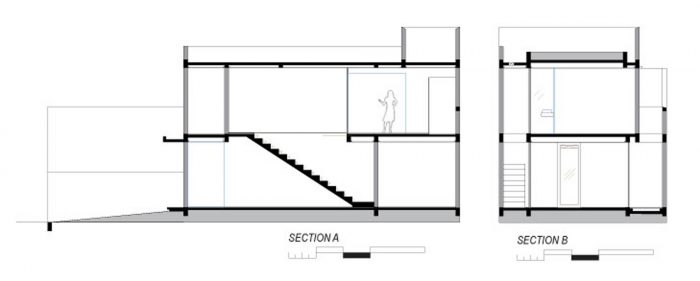 这两层都有一条走廊,其形状就像建筑右侧的一个侧院。这样一来,建筑看起来只有4.65米宽,并且向左倾斜。在侧院的一侧,有一个开放的空间。