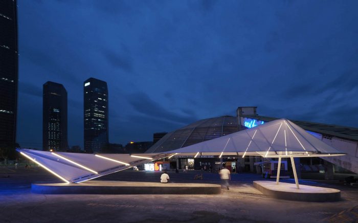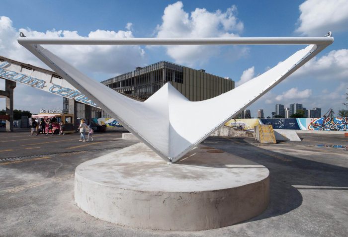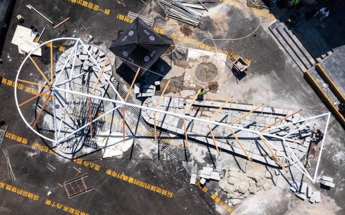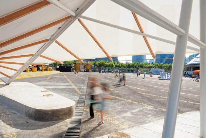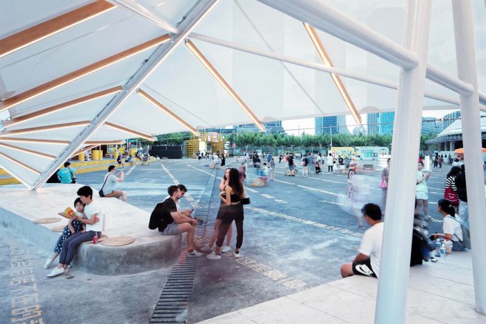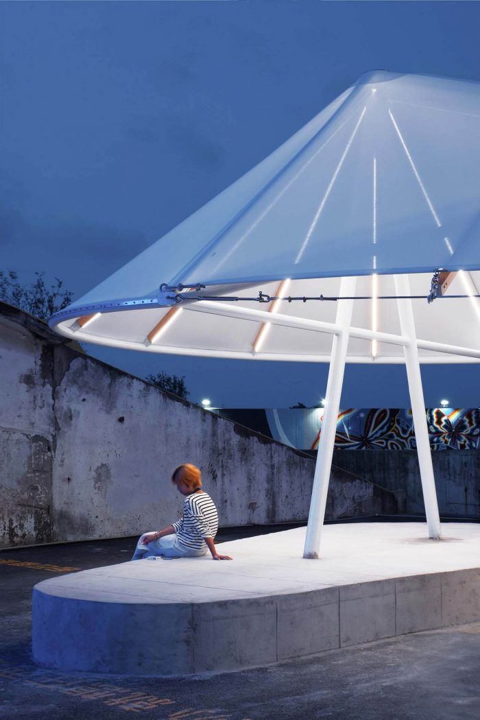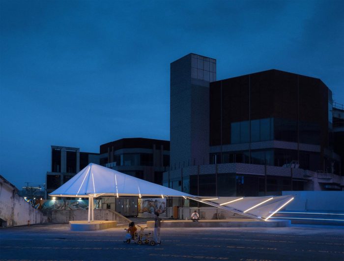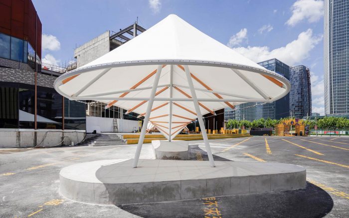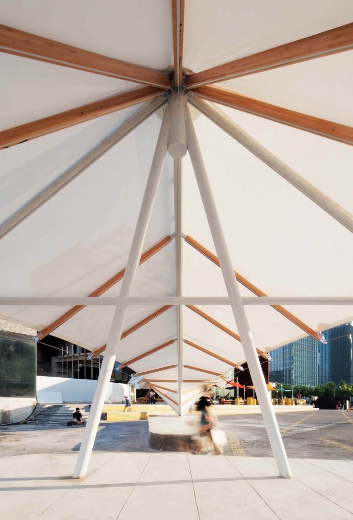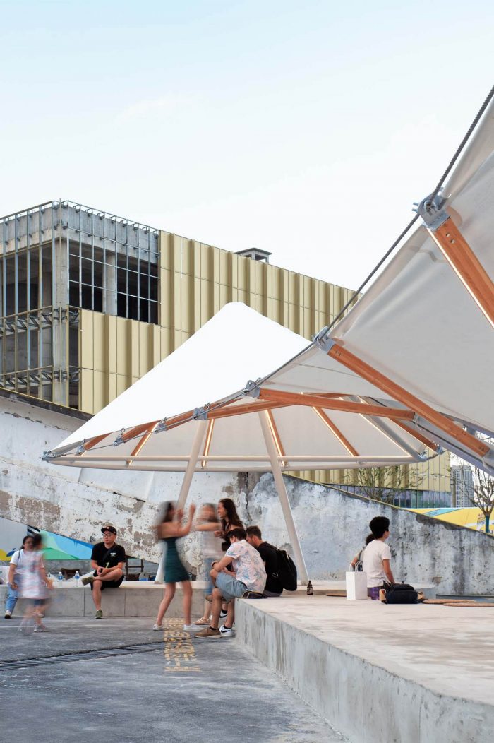 The " Kite Pavilion" is located in the West Bunk Dome Art Center Square on the Xuhui Riverfront in Shanghai. This area was formerly the Shanghai Cement Plant in the 1920s. The dome and the conveyor belt were preserved as an industrial site and reactivated as a carrier for contemporary art and public events. As various events take place at the Dome Art Center, the square will be filled with crowds of people, creating a vibrant riverfront public space in Shanghai that gives a sense of open place. Dean Li Xiangning of the College of Architecture and Urban Planning at Tongji University planned the West Bund& Tongji Construction Festival here, and the Kite Pavilion is one of the three Pavilions.