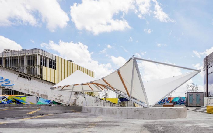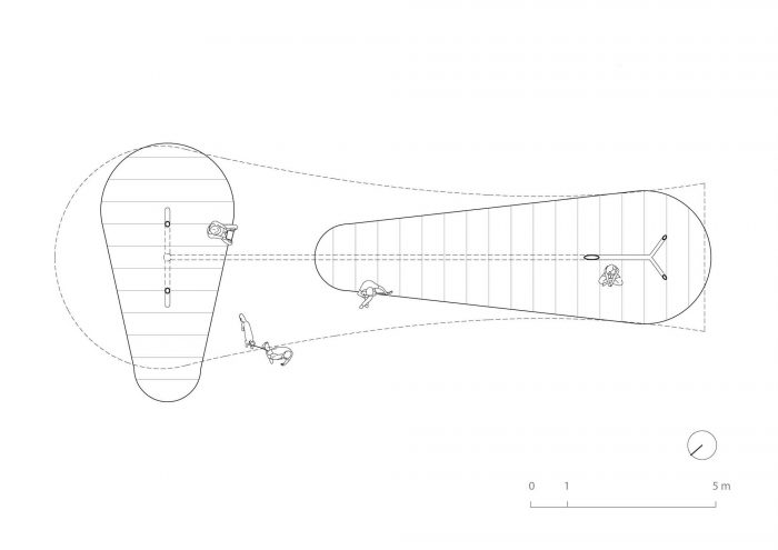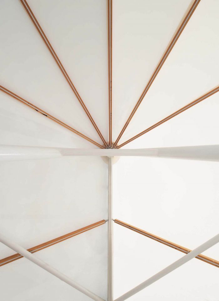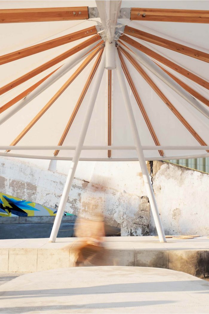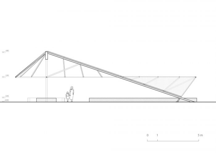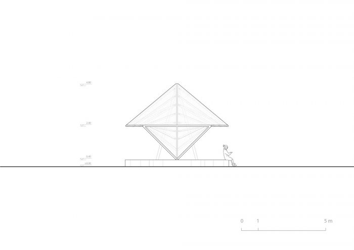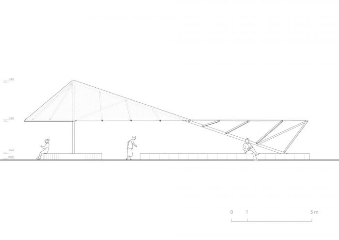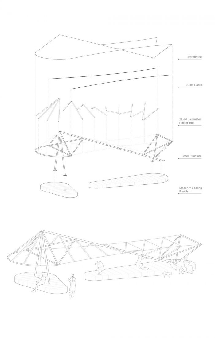 由外部关系和物理感知形成的形式通过与结构的磨合来实现,钢、木、膜的混合结构被共同强调,以达到一个简单的结果。屋顶由膜、侧索和木质支架组成,通过弹性张紧系统保护其不受河边强风的影响。人字形支撑和中央斜向支撑是主要的支撑结构,形成三个落点。半圆锥形的悬挑和三角桁架构成了屋顶结构两端的刚性支撑,它们被涂成白色,以淡化在屋顶上。体积的末端以点状连接的形式落在坐凳之上,引发了人们对轻盈和不稳定性的感知错觉。