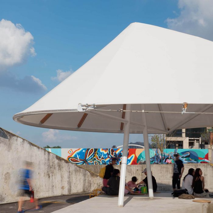 The form formed by external relations and physical perception is implemented by grinding with the structure, and the hybrid structure of steel, wood, and membrane are jointly stressed to achieve a simple result. The roof consists of a membrane, side cables, and wooden braces, which are protected against strong winds on the riverside by an elastic tensioning system. Herringbone bracing and central diagonal bracing are the main supporting structures, forming three drop points. The semi-conical overhangs and triangular trusses form the rigid supports at the ends of the roof structure, which are painted white to fade into the roof. The end of the volume falls on top of the seating bench in the form of a point joint, triggering the illusion of perceived lightness and instability.