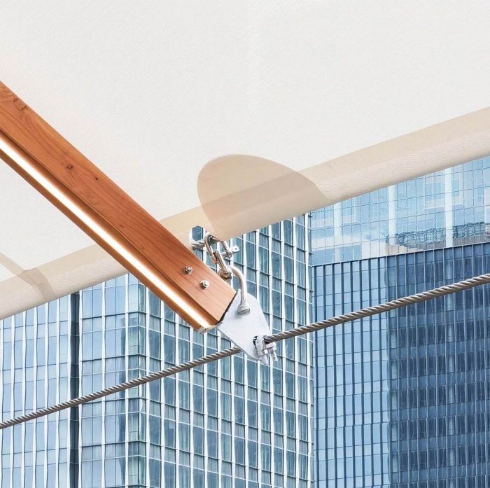 The repetitiveness of the components and the simplicity of the joint detail were the foundamental reason for the rapid construction of the Kite Pavilion in six days. The main structure of the kite pavilion can be divided into three types: round steel pipes, glued wooden poles, and steel cables. Tensioning the steel cables was the final step in the construction of the main structure, and the flexibility of the cables absorbed the construction errors of the steel and wood poles. The design intentionally arranges the concealment and protrusion of the construction nodes, with two cables on the long side of the volume. The membrane cable crosses the hole in the ear plate against the top and is wrapped in the membrane to fix its edge form. The side cords are connected to the end of the wooden pole by the ear plate to fix the pole and tie the whole structure, and the gap between it and the membrane makes the side cords exposed, thus increasing the slimness and lightness of the edge of the form.
