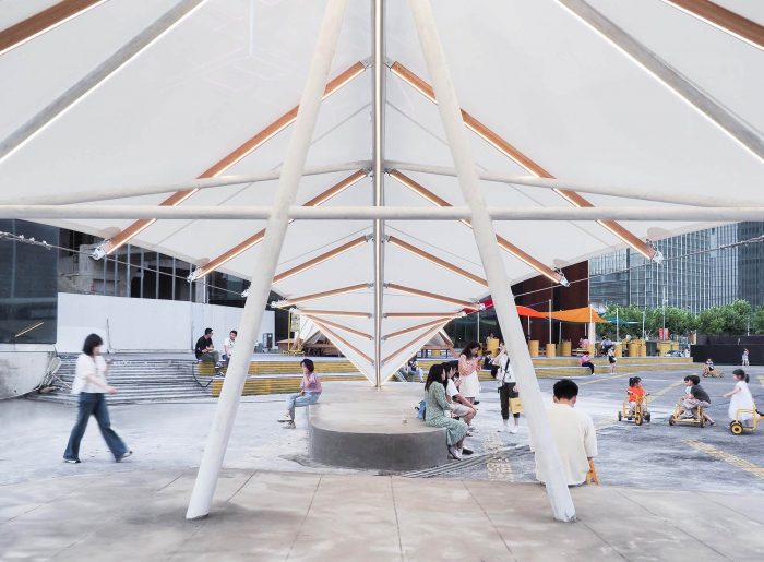 The design relates the pavilion to the square through the operations of "Frontality and Objecthood". The pavilion is located at the edge of the square formed by the industrial heritage, surrounded by buildings and walls, which means that only one main side is experienced by most people. The long side of the pavilion is thus oriented towards the square, allowing the horizontal eave to be seen as well as the convex and concave sides of the pavilion, both inside and outside. The design intended the kite pavilion to be an easily recognizable public exhibit on the site, inviting people to come and sit. The specific landing point of the pavilion was finally chosen in the northeast corner of the site, in the gap between the building and the fence. The seats of the pavilion are divided into two parts, leaving the circulation from the square to the public restroom. When people approach, they can see the distant sky through the space squeezed by the benches and the roof, which amplifies the rare perception of "emptiness and transparency" on the edge of the site.