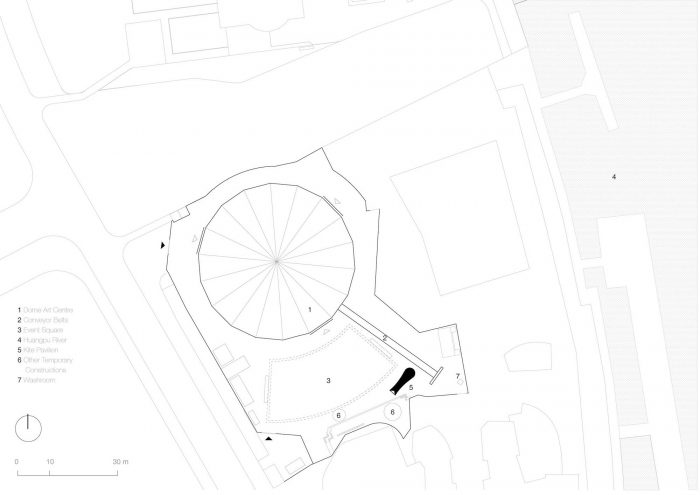 风筝馆 "位于上海徐汇河畔的西双层穹顶艺术中心广场。这个区域的前身是上世纪20年代的上海水泥厂。穹顶和传送带作为一个工业遗址被保留下来,并作为当代艺术和公共活动的载体被重新激活。随着各种活动在穹顶艺术中心的举行,广场上将挤满人群,在上海创造一个充满活力的河岸公共空间,给人以开放的感觉。同济大学建筑与城市规划学院院长李香凝在这里规划了西外滩&同济建设节,风筝馆是三个馆中的一个。