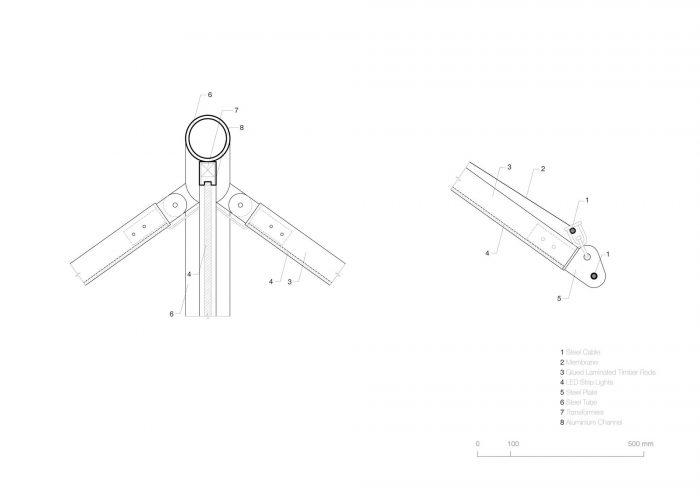 组件的重复性和连接细节的简单性是风筝亭在六天内快速建造的基本原因。风筝馆的主要结构可以分为三种类型:圆形钢管、胶合木杆和钢缆。张拉钢缆是主体结构施工的最后一步,钢缆的灵活性吸收了钢管和木杆的施工误差。设计有意安排了施工节点的隐蔽性和突出性,在体量的长边有两根钢索。膜索穿过耳板上的孔,靠着顶部,被膜包裹着,以固定其边缘形态。侧索通过耳板与木杆的末端连接,以固定木杆并捆绑整个结构,其与膜的间隙使侧索暴露在外,从而增加了边缘形态的纤细和轻盈。