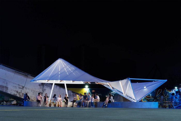 Capturing the characteristics of the riverfront site, the design adopts the intention of a kite flying in the wind to create a light perception. Its linear form maximizes the extension interface, providing the possibility for various behaviors such as staying, resting, and crossing freely. The roof of the kite pavilion is curved by folding the straight lines along the central axis, forming a dome on one end and a pair of wing-shape on the other. At night, the volume turns into a fish-bone-shaped luminous body, which illuminates the site like a suspended lantern. The "kite pavilion" becomes a playful urban landscape, stimulating people's imagination and their natural desire to interact with it.