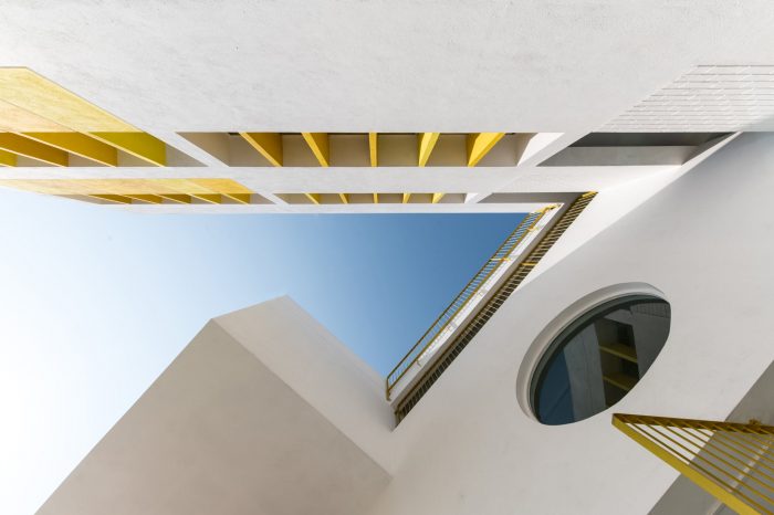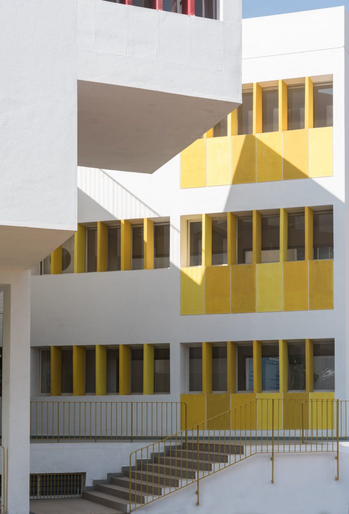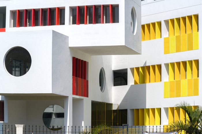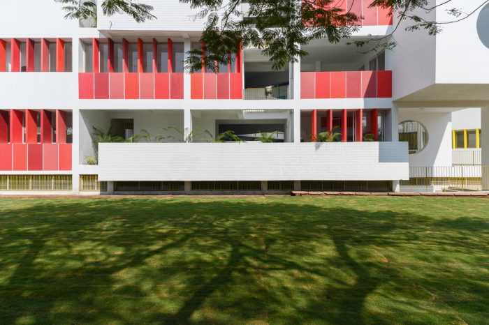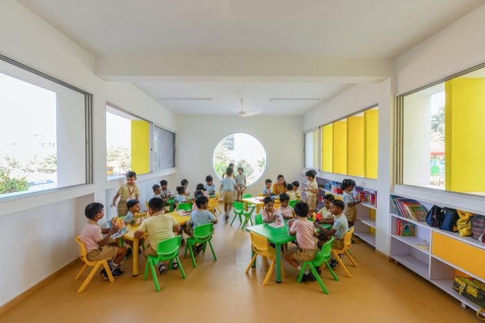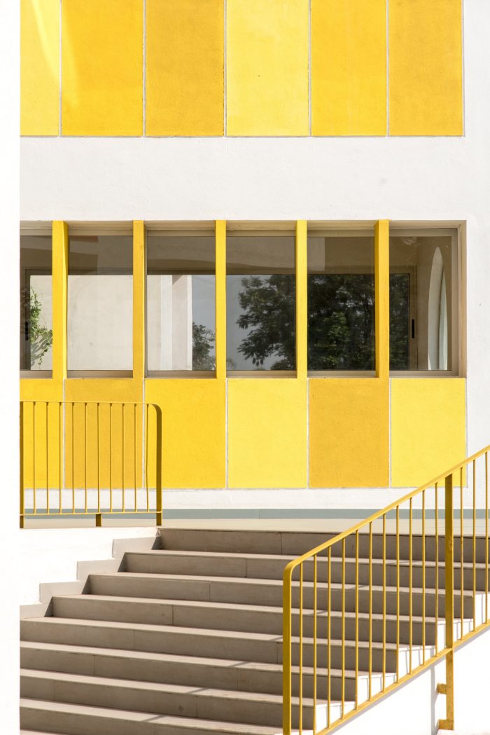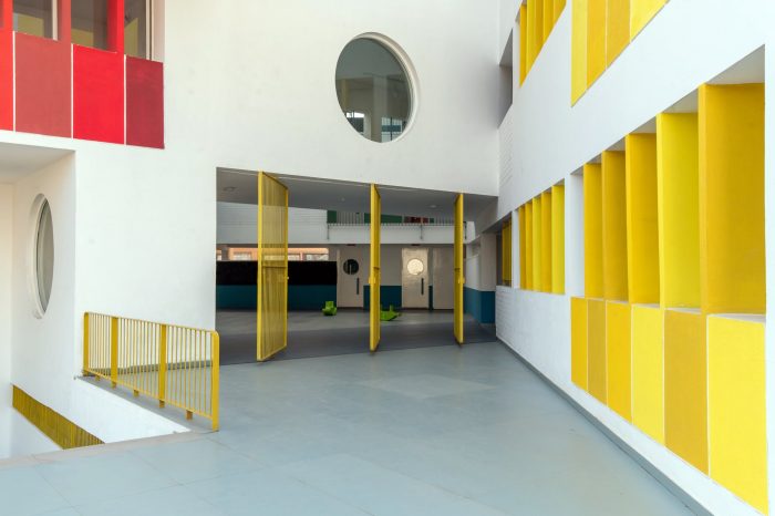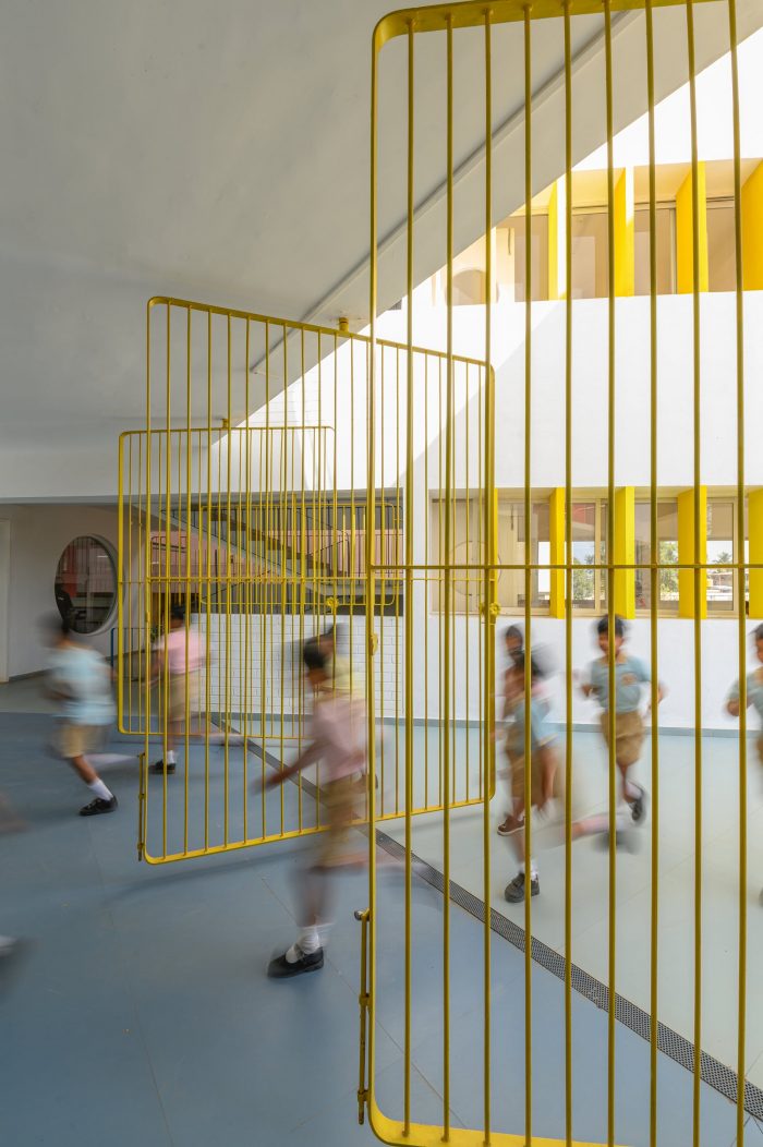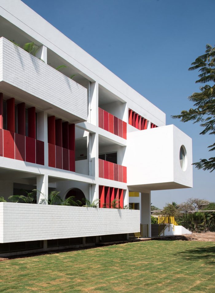 The architectural language of openness, continuity, security, vibrancy, and unity is choreographed throughout by the thoughtful positioning of the courtyards, classrooms, staircases, corridors, and double-height spaces which connect students across grades. In response to the shape of a triangular site, three blocks are looped into each other enveloping all the spaces around a central triple-height courtyard. The circular windows and the colorful Brise-soleil in shades of yellow and red are a metaphor for the kindergarten kids' naiveness, childlike and energetic nature. This celebration of architectural features runs in and out of the building framing the indoors and outdoors through these fancy fenestrations. The massing of the built form is blossomed by stacking rows of classrooms within the three sides of the plot. With a rhythmic twist and turn of these blocks, a volume of cubes jutting out at perpendicular and angular degrees assists in creating simple yet powerful architectural volumes.