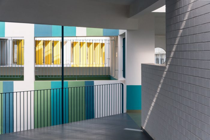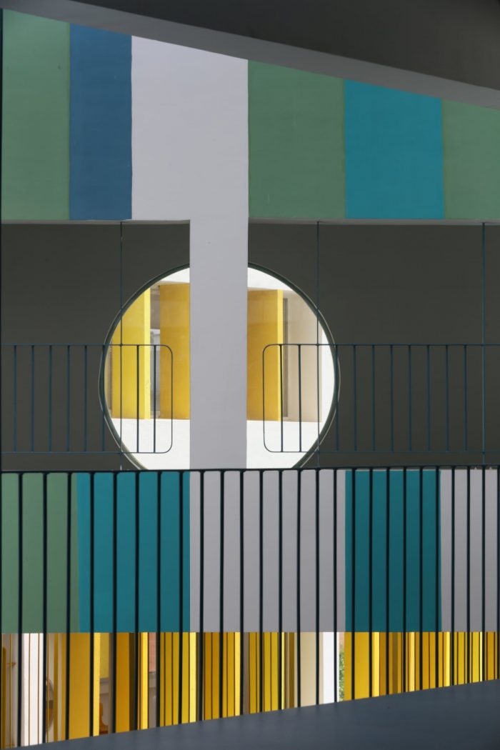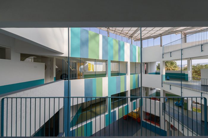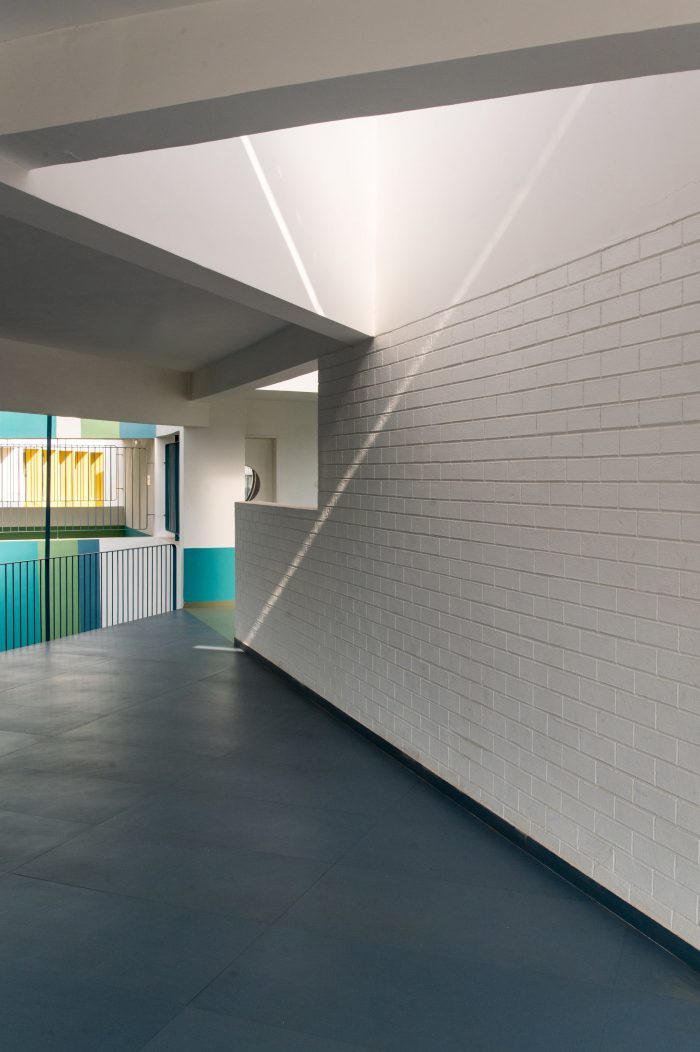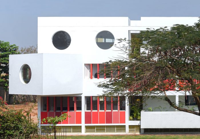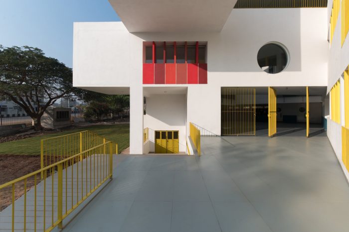 Sanskruti School is an exclusive pre-primary school for an already existing school campus at Gokak. The planning philosophy is directed by considering the psychological and physical needs of kindergarten children who have tendencies to explore spaces with exciting avenues and colorful vistas with minimum boundaries. A triangular-shaped piece of land sandwiched between an existing school building on the north, a set of playgrounds on the east and west sides, and the campus property edge abutting the city’s vehicular road on the south was identified as an appropriate location for a new pre-primary school building, crafting the elevation for the entire campus as it stands in the foreground of the existing buildings.