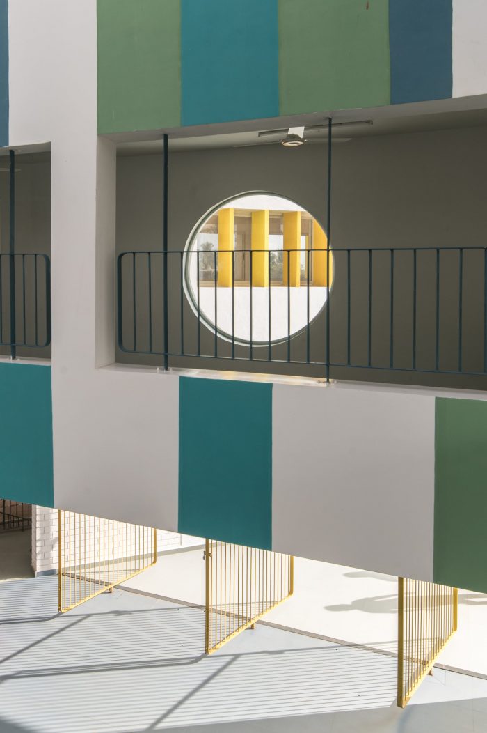 Certain climatic concerns have played a key role in designing this building in Gokak, a warm and arid city. The northeast side of the site is chosen to accommodate all the classrooms, such that its openings are free from the harsh glare of the south. All the activity spaces, corridors, staircases, courtyards, admin staff, and activity rooms are placed facing south which acts as a buffer from vehicular traffic and summer heat, encouraging students to learn and grow in naturally lit and comfortably shaded spaces of the built form.