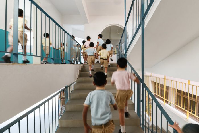 南部的一个楼梯是一个直梯,卡在南部的花园球场和中央庭院的内部走廊之间。北面的一个狗腿楼梯,开在正式教室和非正式户外活动区的紧密安排之间,引导学生到地下室进行课间休息和午餐休息。从建筑的中庭直接进入地下室的通道是为大型的学生聚会而设置的。低年级学生的教室、教员室和一个多功能活动室都位于一楼。同样地,UKG学生的教室、一间日间卧室和一间玩具室位于二楼。每层楼都有一个厕所,位于建筑的后侧,两个教室的网格相交,使其便于从所有地方进入。