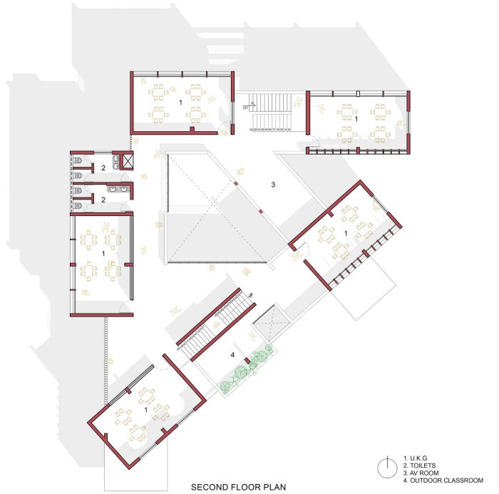 A staircase in the south is a straight flight of staircases jammed between the garden courts in the south and the internal corridors of the central courtyard. A dog-legged staircase on the north, opening between tight arrangements of formal classrooms and informal outdoor activity areas guides the students to the basement for recess and lunch breaks. Direct access to the basement is caved in from the atrium of the building for larger gatherings of students. Classrooms for LKG students, a staff room, and a multipurpose activity room are located on the first floor. Likewise, classrooms for UKG students, a day bedroom, and a toy room are located on the second floor. On every floor, a toilet block is accommodated at the rear side of the building where two grids of classrooms intersect making it convenient to access from all.
