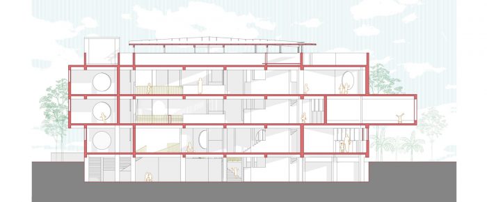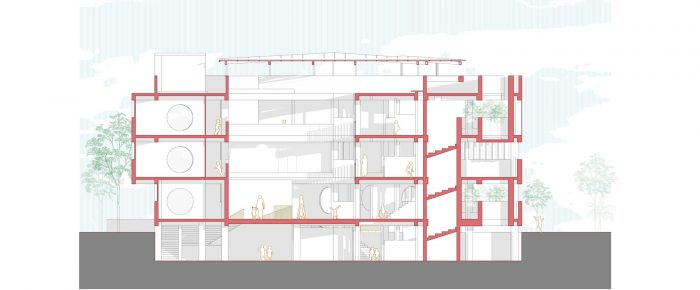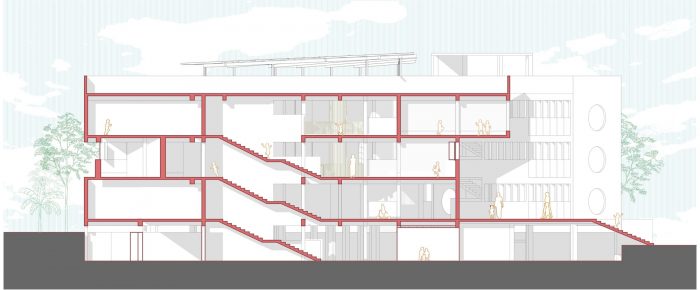 A triple height court formed by crossing these spaces generates an effective stack effect, reducing the need for artificial ventilation and cooling systems. The plinth level of the school is contoured in response to the site context. The primary entrance to the atrium and the basement floor is a direct entry from the south. An amphitheater on the east facing the playground acts as another stairway entry leading up towards the atrium. A ramp running parallel to this assists the challenged. At the entry level on the ground floor, three nursery classrooms, a principal’s cabin, and a crafts room are planned around a central atrium. The school's main entrance from the east is accessed through a series of steps formed by the site's natural contours. These steps double up as an OAT facing the existing playground.