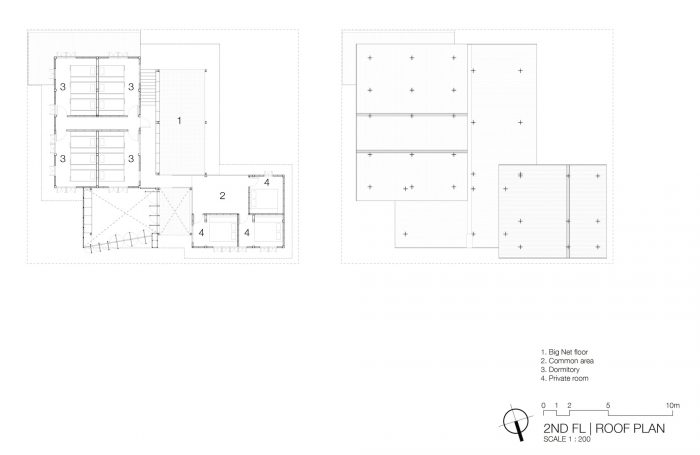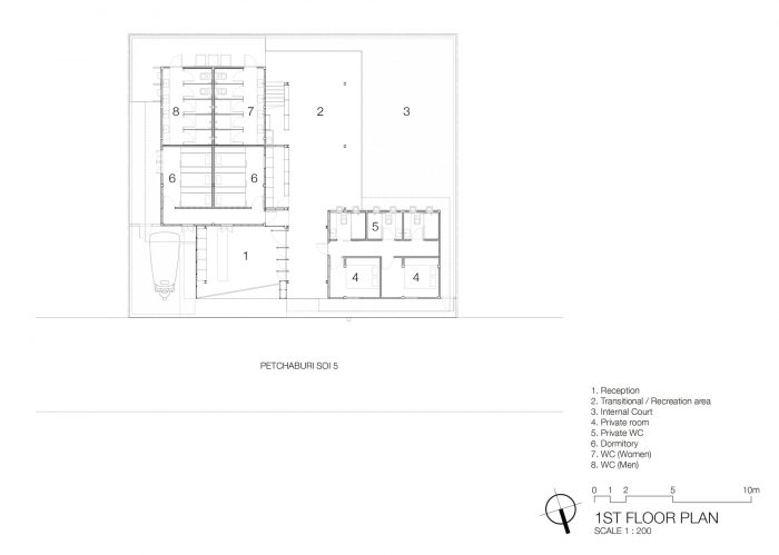 For the space management, the bigger building consists of a four-bedded and six-bedded women dormitory with shared toilets / shower space in the back on the ground floor and 2 three-bedded, 1 four-bedded and 1 six-bedded men dormitory on the upper level. The Bed with working table, locker, and shelf for self-decoration is designed for these specific rooms with a soft curtain as a divider for privacy. The smaller building consists of 2 private rooms and 3 bathrooms on the ground floor with 3 more private rooms with recreation deck on the upper level.