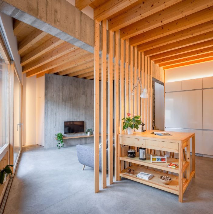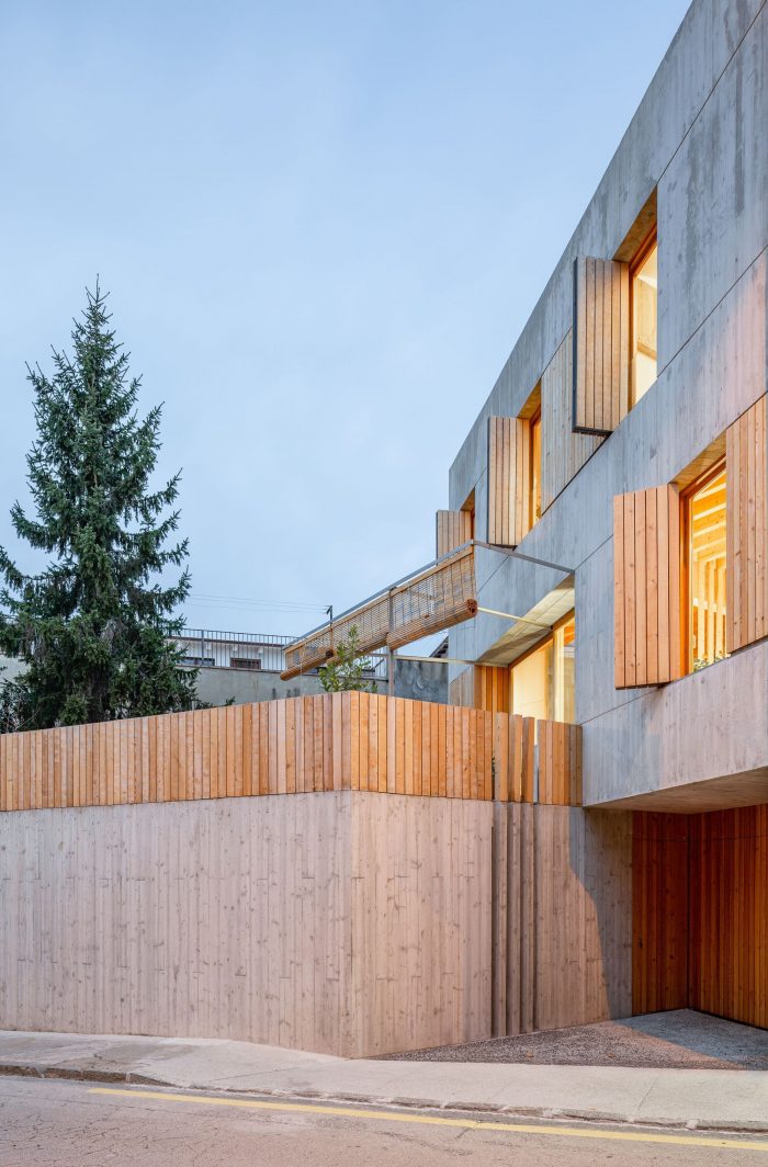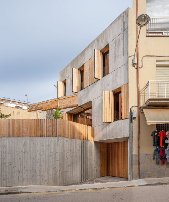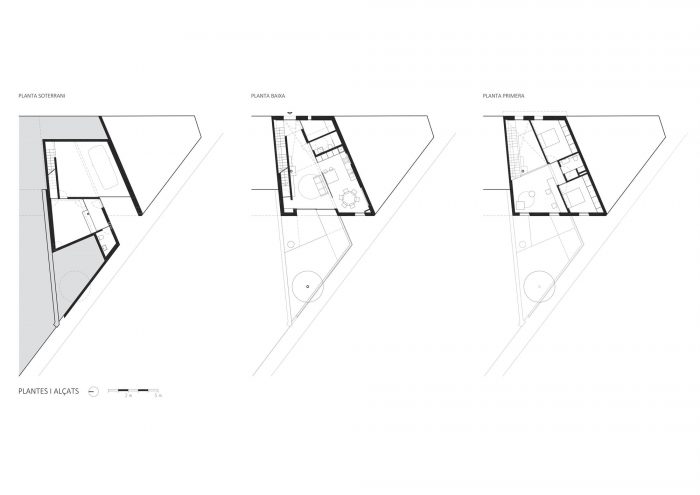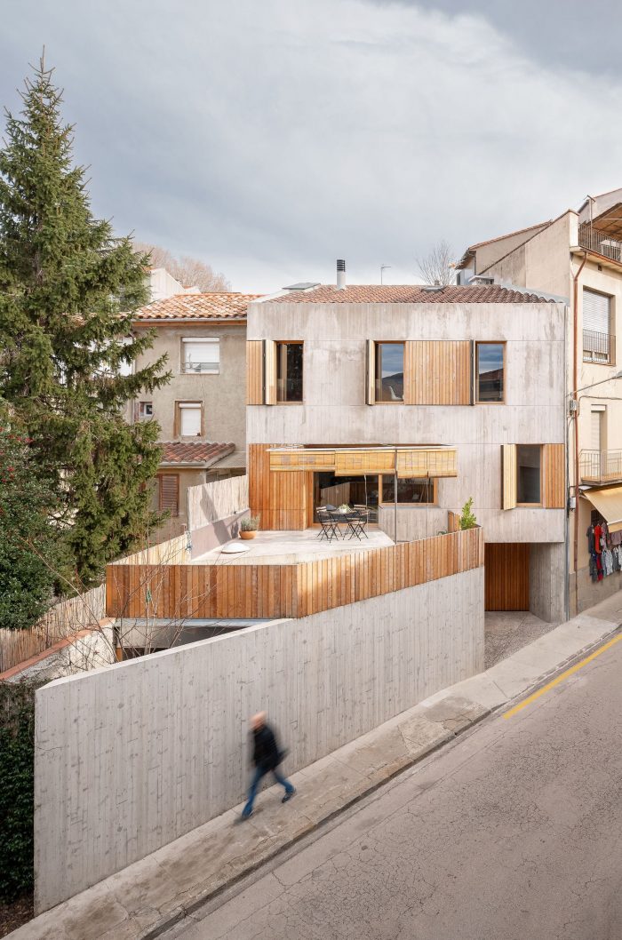 The double road alignment to be followed makes it possible to break up the rigid volumetry of a building between the dividing walls into two parts: the garden and the house. And the difference in height between the two streets that confront each other allows for the neat leaning of one volume against the other, while the road access is arranged underneath the house.