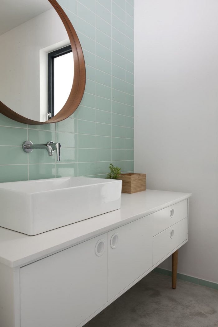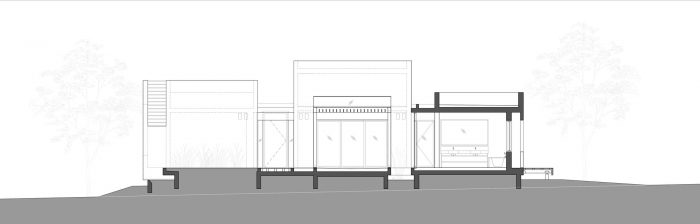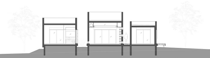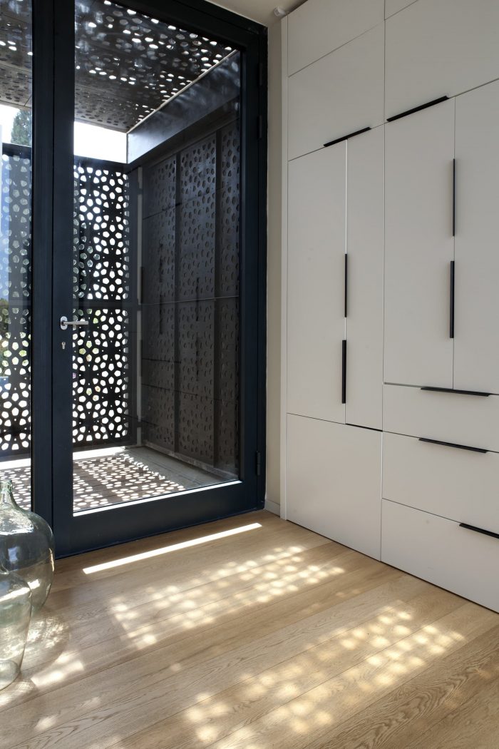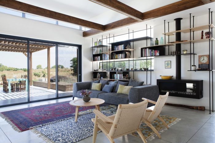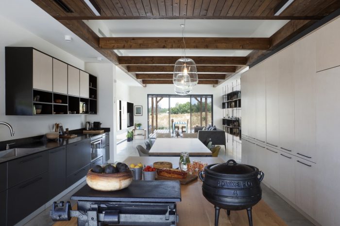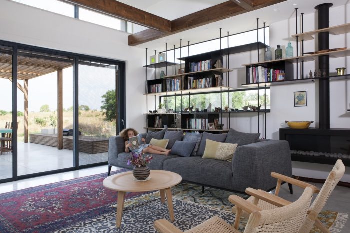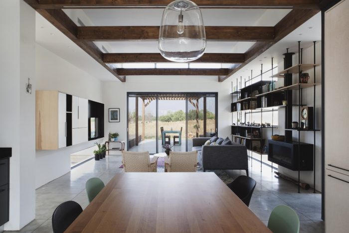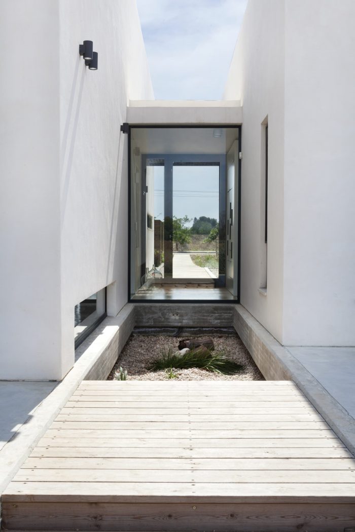 Raised above ground level over a concrete slab, due to the site limitation, the volumes are divided into 3 parts that are connected with transparent glass joints that allow one to walk and look through from the street directly to the fields beyond the house. The main central volume was created as a place for family togetherness, the heart of the home, and includes the living room and the integrated eating-cooking area.