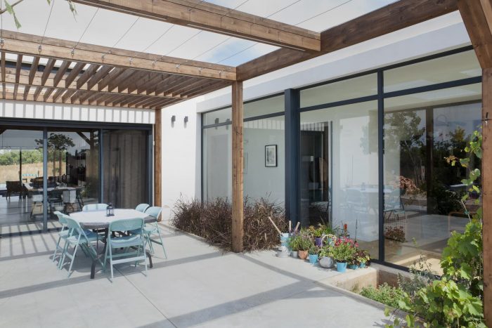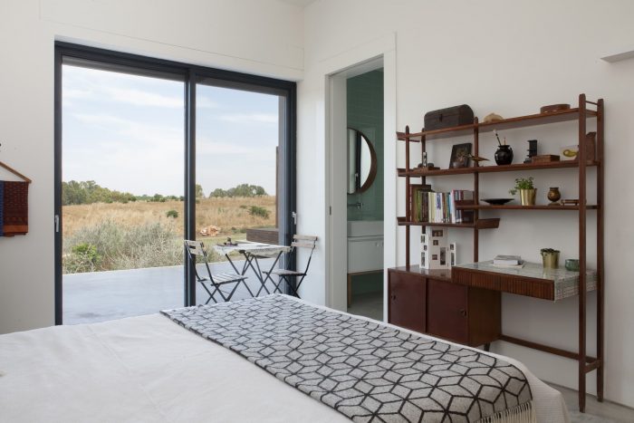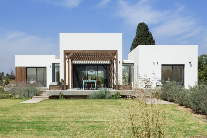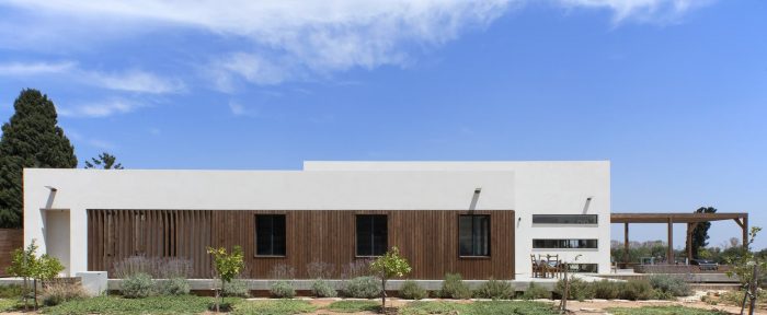 The architect designed her own family house in a small village, located between wheat and chickpea fields. The geometry and the contours of the house continue the long, extending lines of the agricultural area, open to the view and the landscape, that is interacting with the indoors, facades and the movement through the house.
