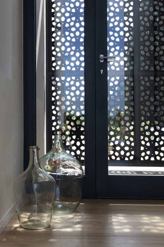 在房子的前面和后面,在混凝土板上有阳台,允许从室内直接进入室外,反之亦然。前面的主阳台是封闭的,将房子与街道隔开,并允许一个放松的、更私人的、渐进的通道进入房子。后面的阳台是完全开放的,可以看到田野和风景。从前面到后面,一个木制的遮阳凉棚被建在房子的主要部分。