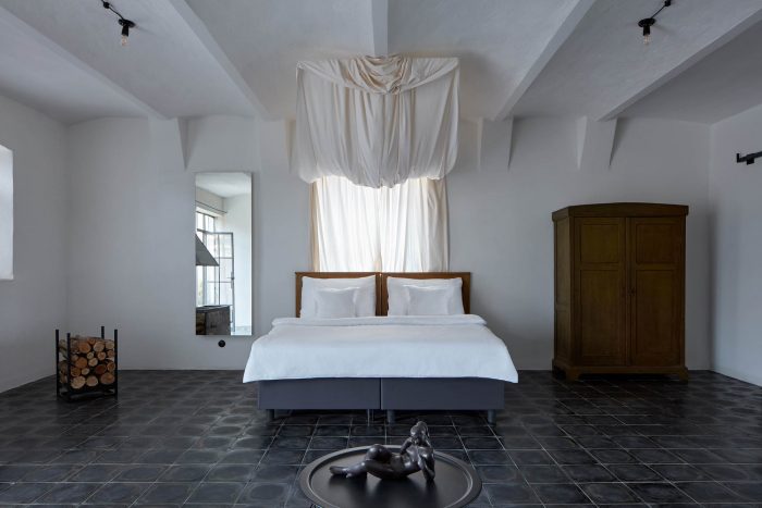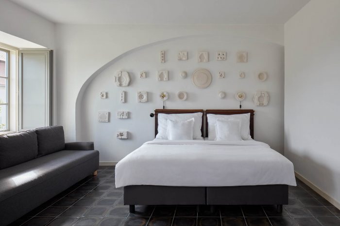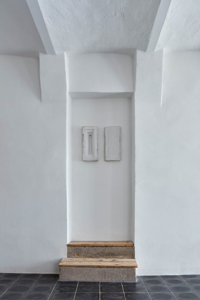 石膏模具。我们发现了大量用于生产陶瓷的原始石膏模具。它们中的许多已经无法使用,或者存在的数量多到永远不会再被使用。我们把这些模具以各种构图挂在屋子里。这些被发现的物品,本身只是生产的工具。我们把它们作为具有自身审美品质的物品来展示。这些模具让人联想到该地区的历史,同时也让游客了解到陶器是如何被创造出来的。