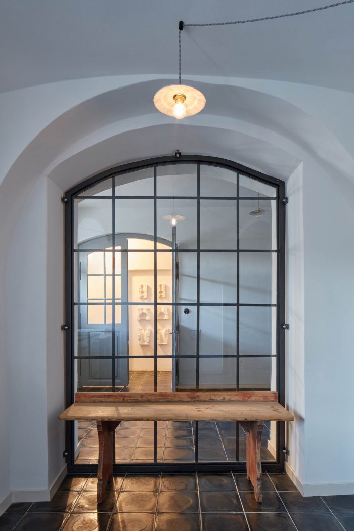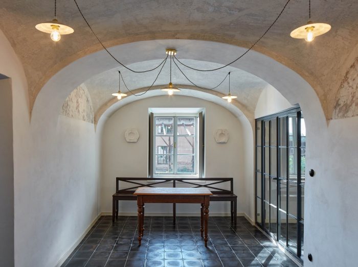 Interior. The interior is intentionally spartan, but it does not lack friendliness. We kept authentic materials and details like doors or the original ornamental wooden floor. New floors are made of basalt and cement tiles. In some places, the original paintings are revealed.