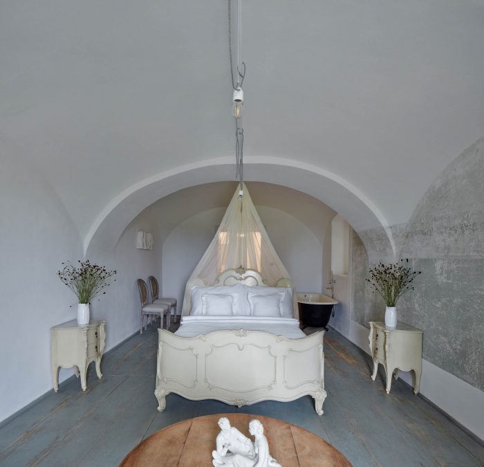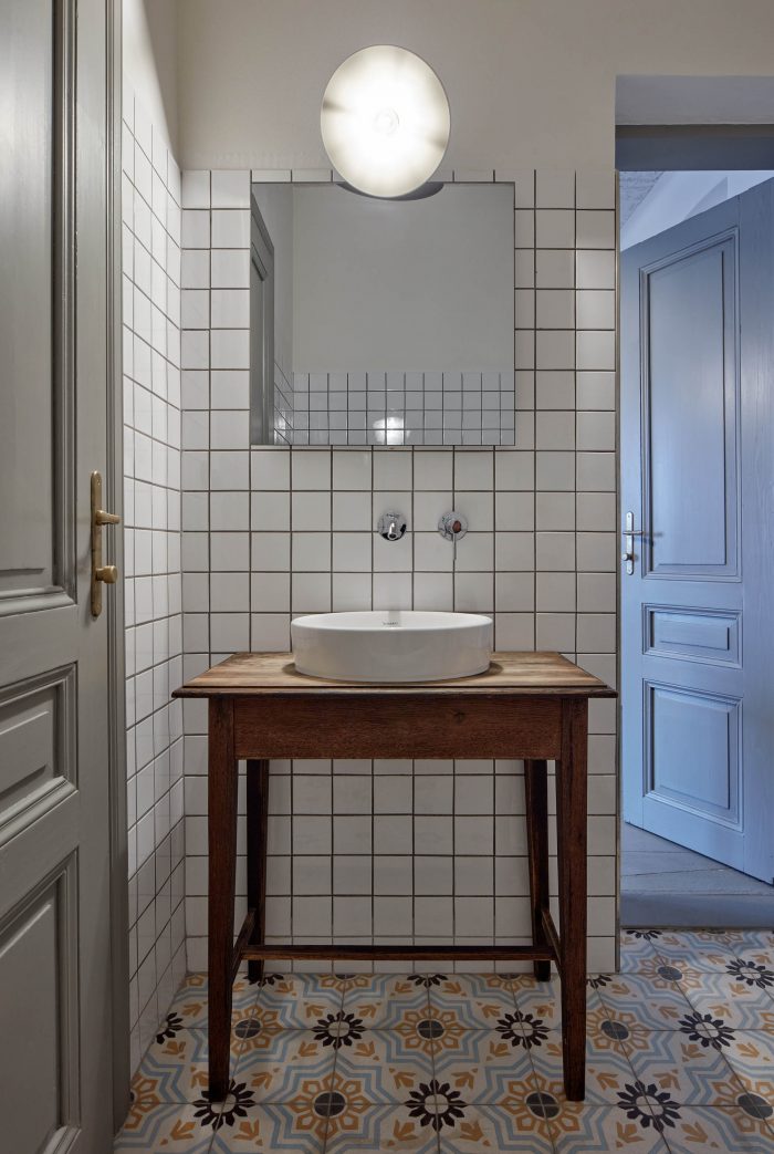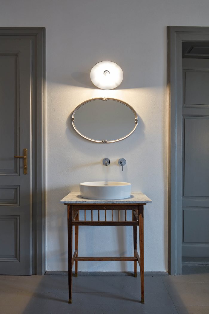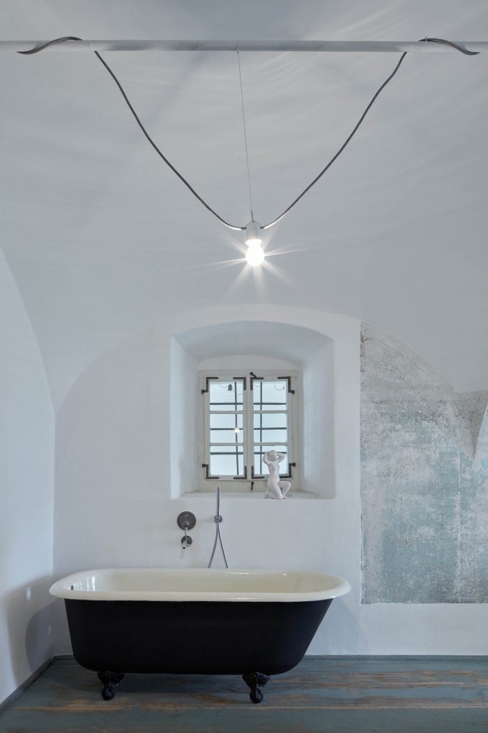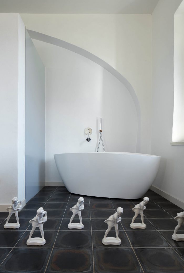 We made maximum use of old furniture - tables, cabinets, chairs, but also tables under wash-basins or old cast iron bathtubs, which we ourselves found and brought from various parts of the country, or bought from our favourite antiquarian. Everywhere one realizes that one is in an old house. But the white wall provides enough soothing for the final collage.