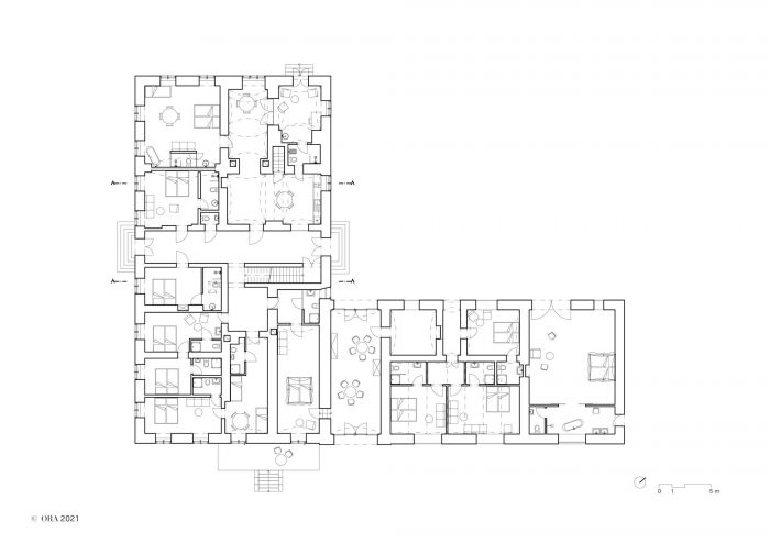 翻新。Kocanda在过去的岁月里经历了许多修改和改造。项目的目的是清理建筑的干扰,创造一个和谐的整体--恢复原有体量的紧凑性,恢复原有的开间,完成原有窗户的复制品--但同时也要避免过度新奇的效果。因此,抹灰只能在局部进行修补,这就导致了外立面的进一步野污。