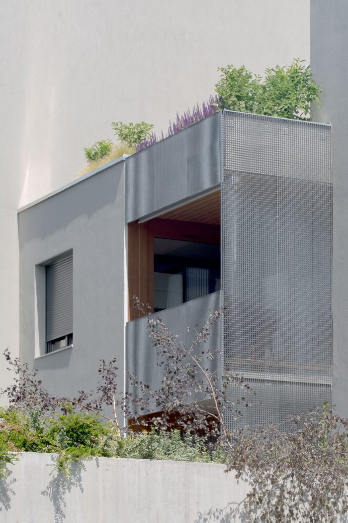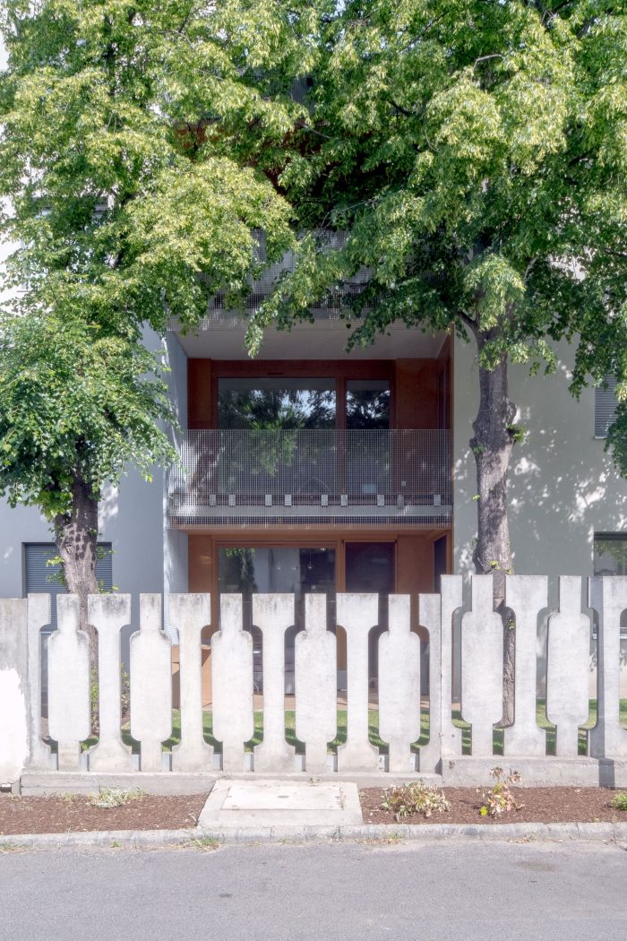 Materials are mainly simple and affordable surfaces due to the economic possibilities of the neighborhood. This changes in the areas where residents interact with the house - entrances, loggias, terraces - where higher quality wooden surfaces, metal meshes, and bare concrete are applied. The metal mesh surfaces of the loggias act like curtains, that allow for different transparency depending on the angle of view. Along with the reflections and shadows of this surface, this gives an ever-changing quality to the exterior shell of the house, while these surfaces were easy and economical to prefabricate and install.