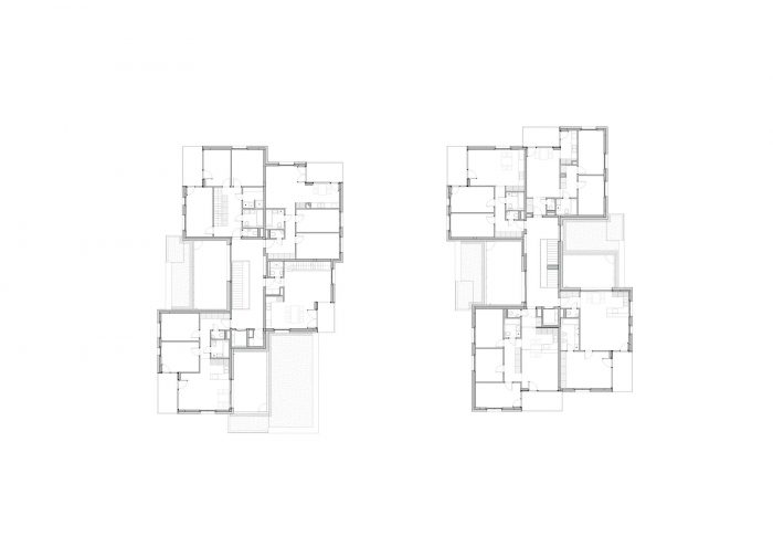 It was important to create a similar, articulated mass as in the previous house, but we have reached the same effect by building towers of the same apartment schemes and simply moving them apart and building different height towers out of these units. As a result, we had a collection of really simple and logical columns.