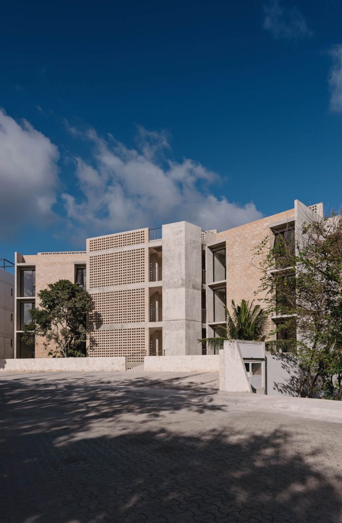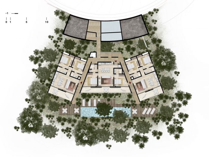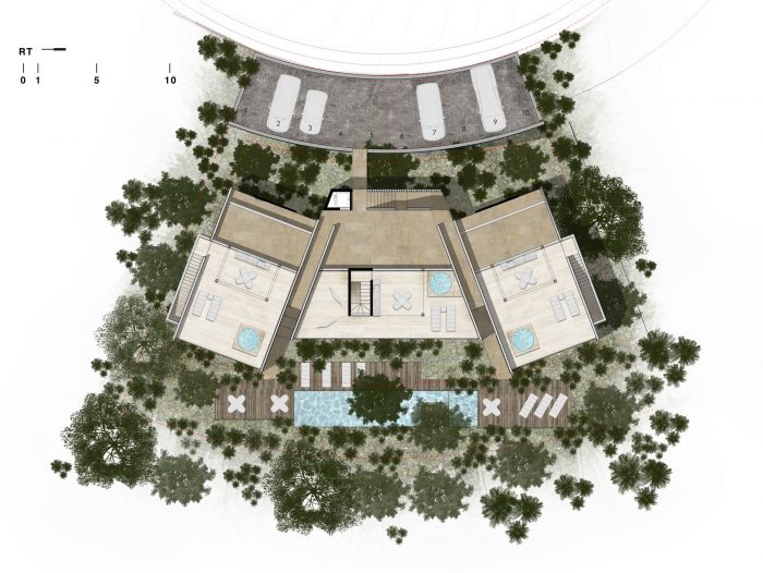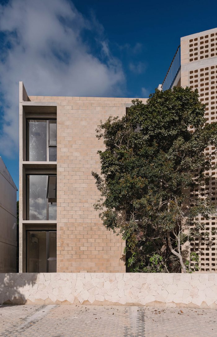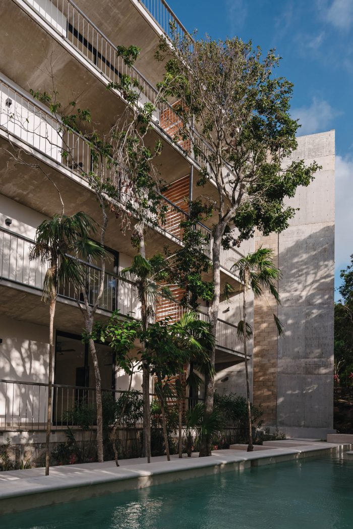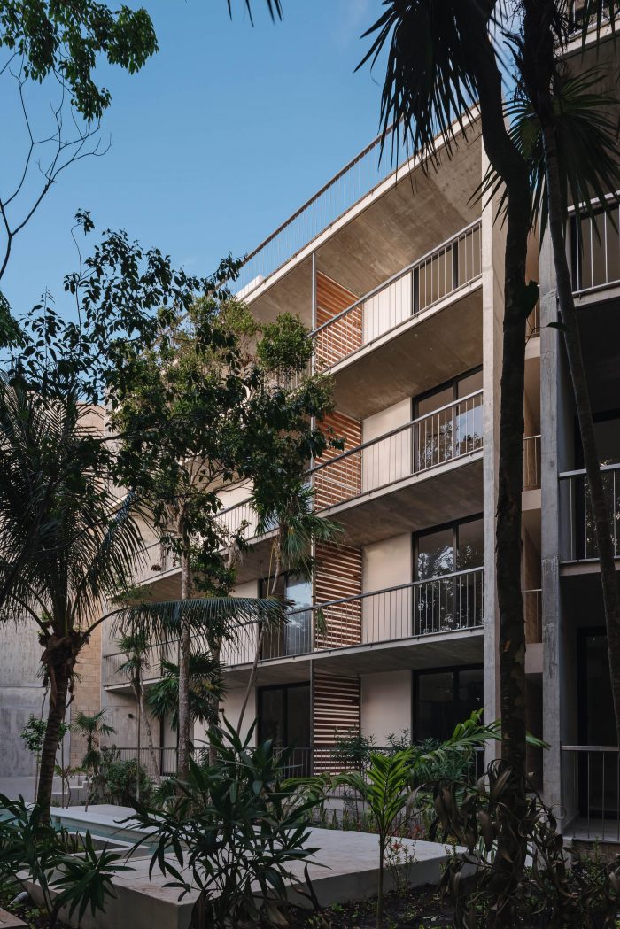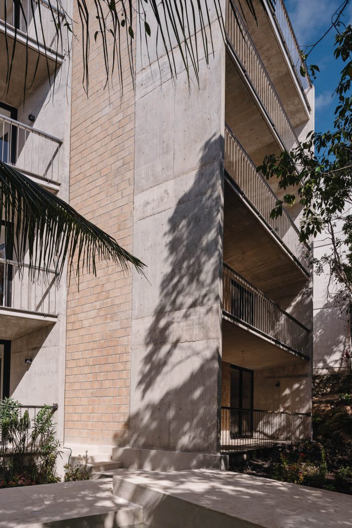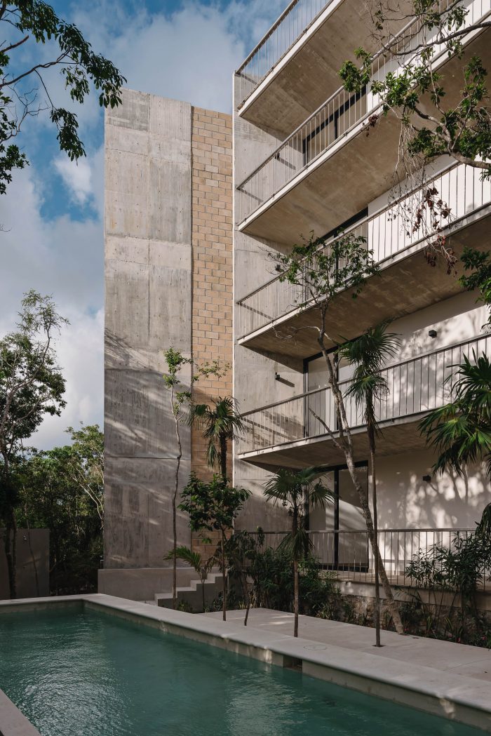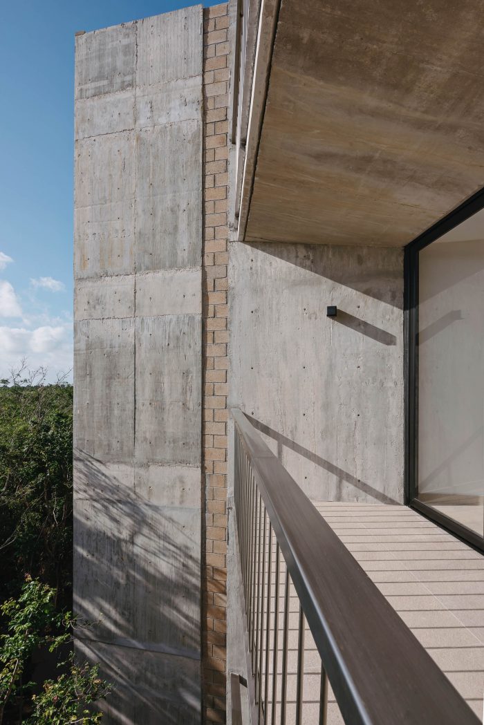 The natural material finish was left untouched so that the building ages with dignity and with as little maintenance as possible. A strict logic was used for material placement using only one direction for concrete and the other for cinder block giving each hierarchy and purity. On the lower level, a long rectangular pool with views to the jungle was proposed, while the private amenities were placed at the roof garden level. The side units have stairs to the outside to avoid an overhead structure and save space inside.
