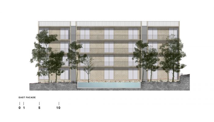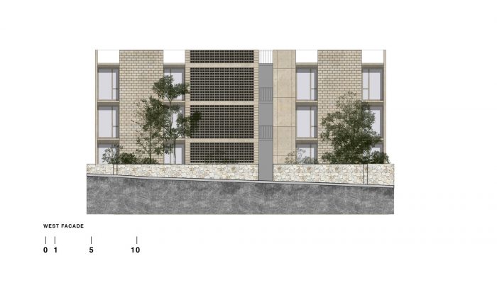 该方案分为3个体量,两个侧面的体量是对称的,中央的体量像一把扇子一样向丛林开放。外立面是低调而坚实的,以保持一定程度的私密性,朝向街道,并软化墙壁的刚性,在楼梯上放置了一个块状格子;在晚上,这将作为一盏灯的功能,用温暖的光线来照明。后面的立面由阳台组成,阳台的尽头是一个狭窄的石板边缘。