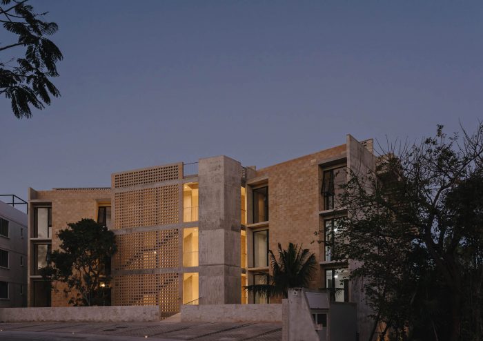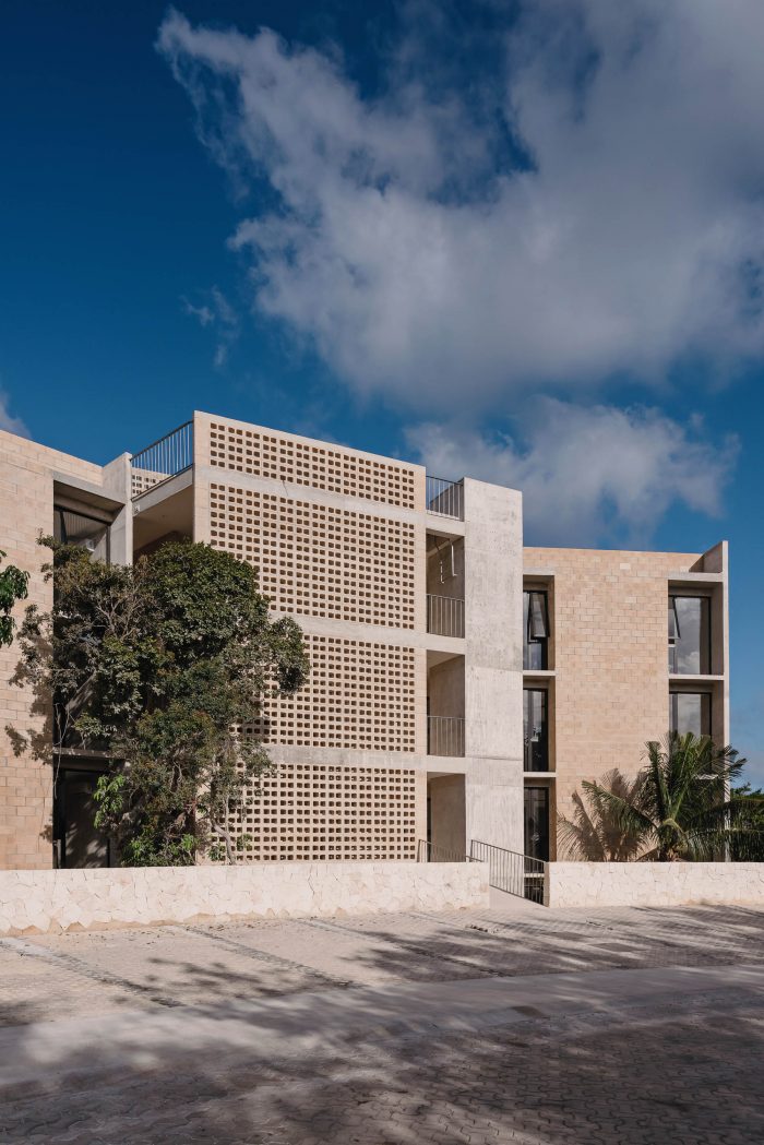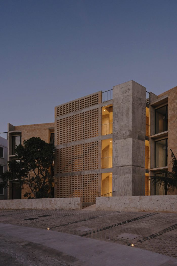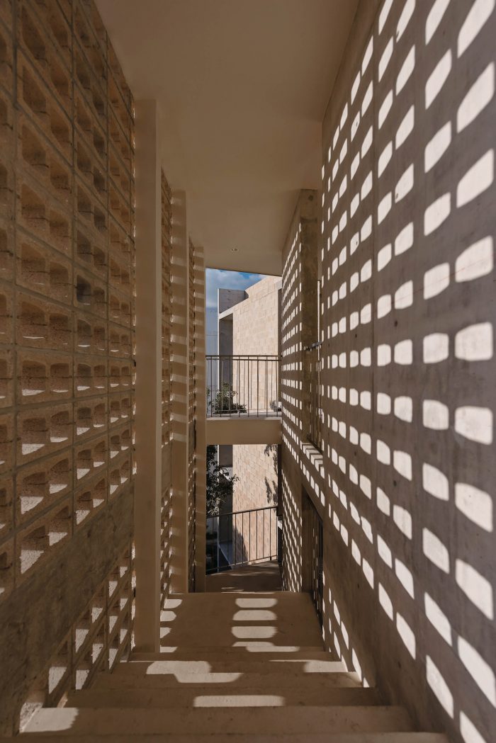 The proposal is divided into 3 volumes, the two side volumes are symmetrical and the central one opens like a fan towards the jungle. The exterior facade is discreet and solid to be able to maintain a certain level of privacy towards the street and to soften the rigidity of the walls a block-lattice was placed in the staircase; This at night is intended to function as a lamp illuminated with warm light. The rear façade is made up of balconies that end in a narrow slab edge.