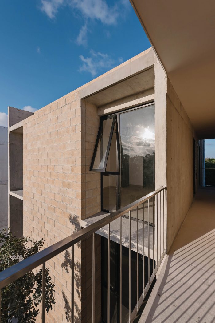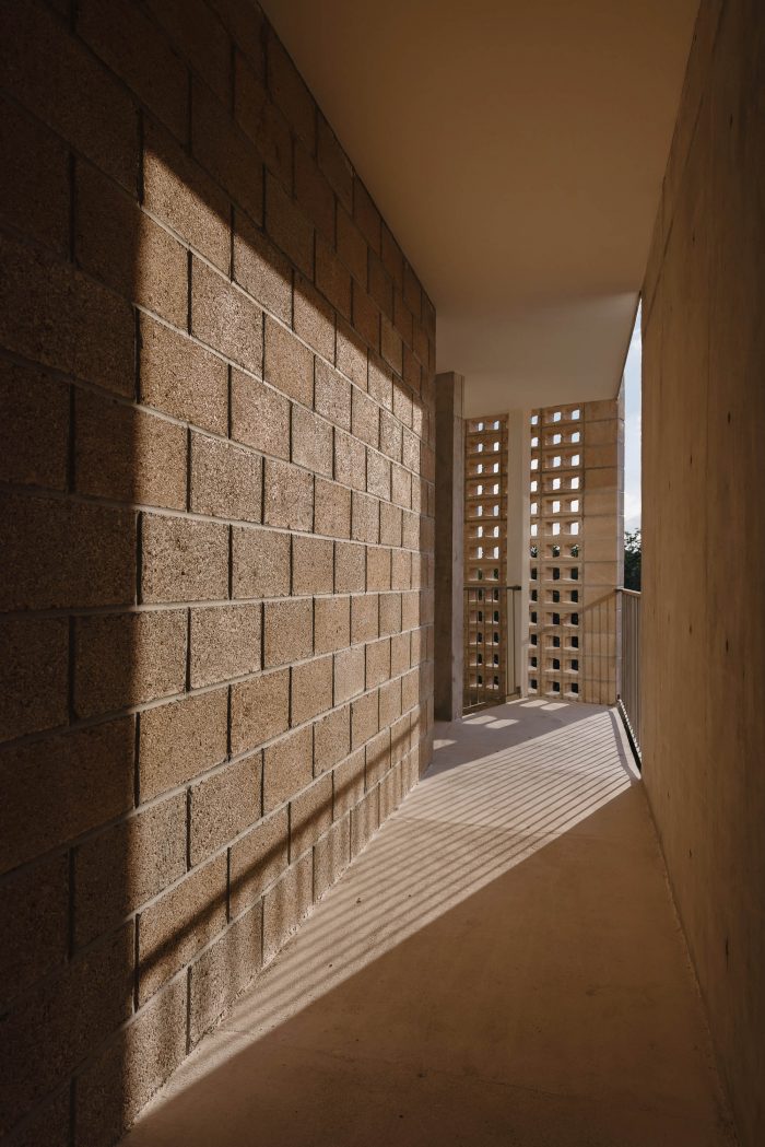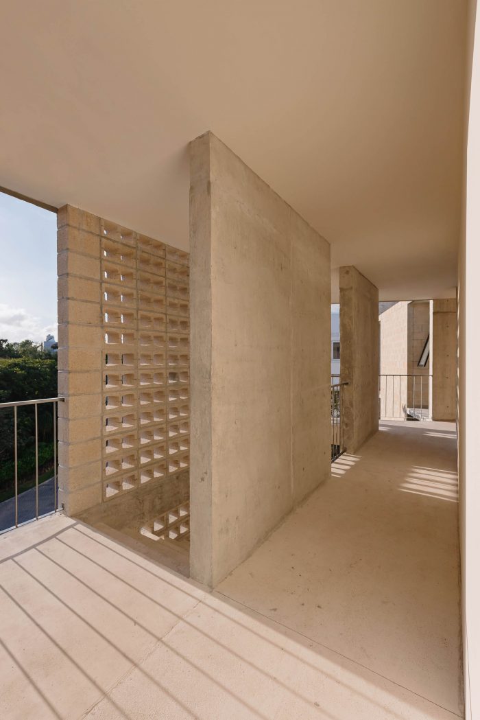 天然材料的表面没有被破坏,这样建筑就可以在尊严的情况下,尽可能少的维修。在材料的摆放上,采用了严格的逻辑,只用一个方向的混凝土和另一个方向的煤渣砖,使每一种材料都有层次感和纯度。在低层,我们提出了一个可以看到丛林的长方形游泳池,而私人设施则被放置在屋顶花园层。侧面的单元有楼梯通向外面,避免架空结构,节省室内空间。