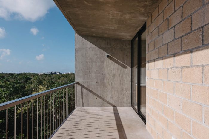 Below the parking lots is the mechanical room and water tanks with the necessary preparations to harvest and purify rainwater. The geometry of the building itself allows for each unit to have its own corridor, thanks to this, and as per client request, the apartments have 2 doors, one for main access and another to a room that the owner can rent independently as a hotel room. The central unit, having the room facing the jungle, has a wooden lattice door to control the access to the terrace in case the second bedroom gets rented.