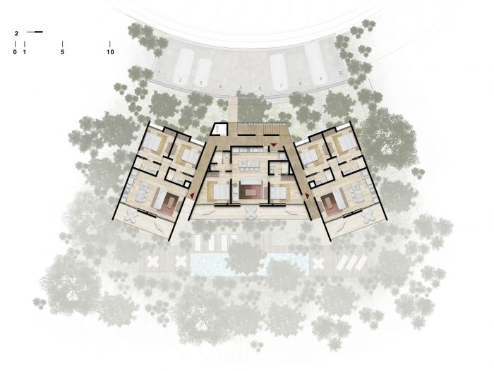 停车场下方是机械室和水箱,并做好收集和净化雨水的必要准备。建筑本身的几何形状使得每个单元都有自己的走廊,得益于此,根据客户的要求,公寓有2个门,一个是主通道,另一个是业主可以独立出租的房间,作为酒店房间。中央单元的房间面向丛林,有一扇木格子门来控制通往露台的通道,以防次卧被租走。