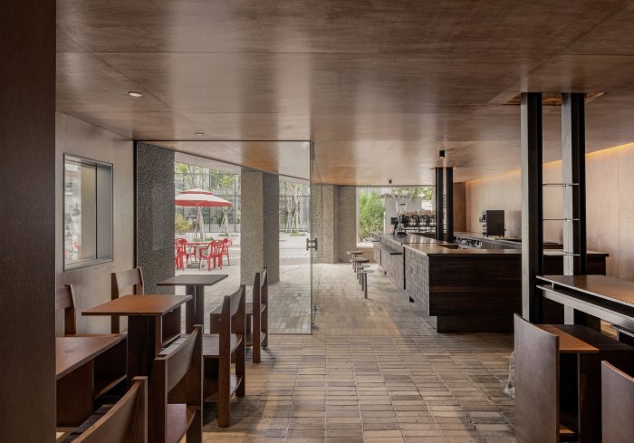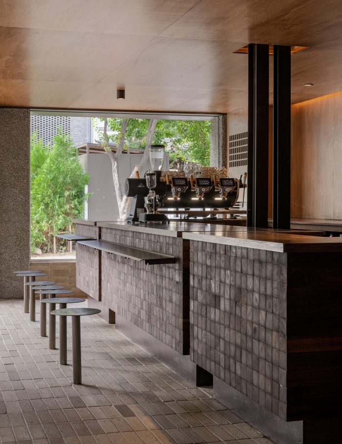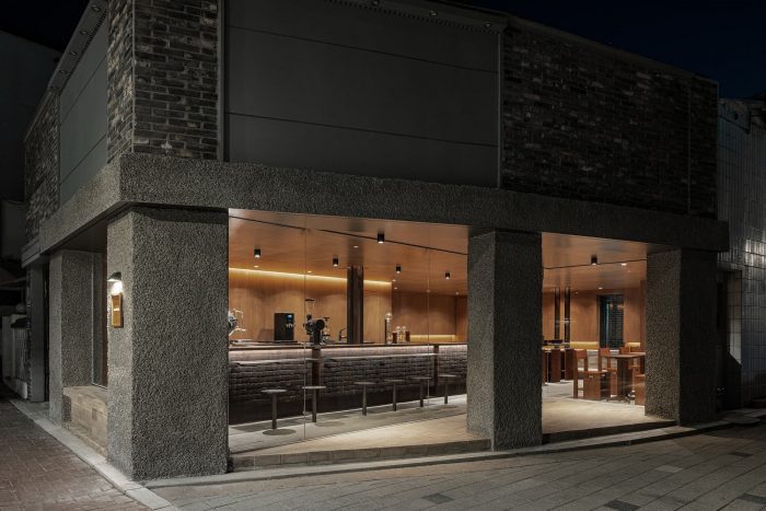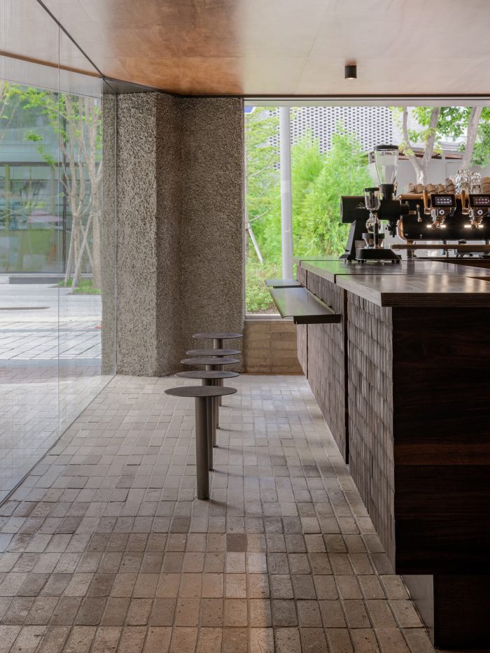 We finished the wall and the ceiling with lawang plywood and finished the floor with cement brick. For designing the counter, which is the core of this space, we had been inspired by the image of a heap of roasted coffee beans. Hence, we decided that walnut wood is a suitable material to express the image of coffee beans since an end grain of walnut wood has deep brown color and soft texture. We arranged the end grain of the walnut wood to be seen in front, by stacking hardwood blocks. Then, we sanded each edge with the hand grinder to make each block could be slightly misaligned. The furniture and the countertop were planned as being made of birch plywood whose grain is clear and soft rather than the lawang plywood which is the background of this space. In addition, we used the rough concrete finish as the exterior wall material. The cold sense of the facade which was finished with rough concrete is contrasted with the warm sense of materials which was used in the internal space.