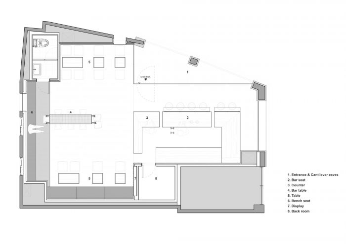 The existing construction site was in the condition as the newly built building with a full of Gross Floor Area. The interior and the exterior were clearly divided by the walls which were extremely adjacent to the architectural boundary line with no spare space. So, we demolished some parts of the outer wall to add a three-dimensional effect to the space. And we planned external spaces like cantilever eaves by giving up using about 3㎡ of the interior space. Also, we broke down the strict boundaries between the interior and exterior by lightly dividing them with glass. Consequently, with the low height, the not stuffy but cozy atmosphere was added to the existing construction site. In addition, by demolishing the outer wall, the interior space invites more natural light, hence we could minimize the internal lighting.