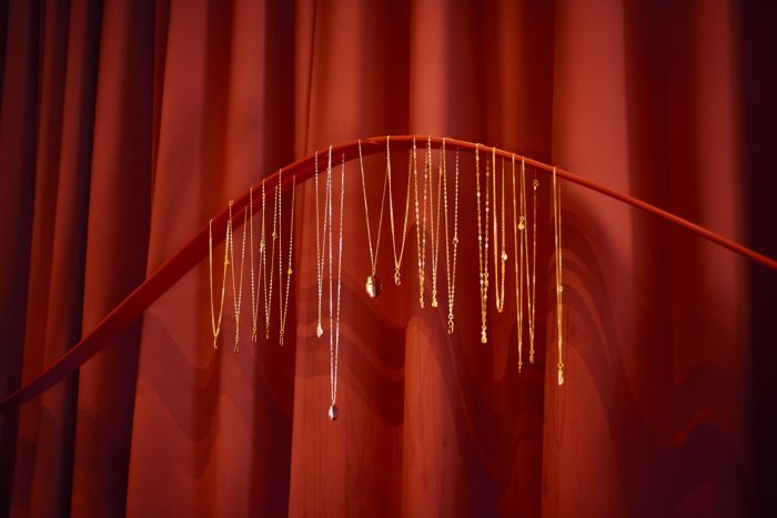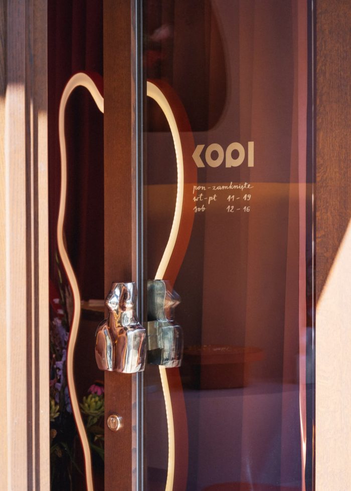 We wanted to take a different approach to the elements of the exposition – that is how we came up with the idea to create a long minimalist ribbon which seems to levitate in front of the curtain – explains Karol from Noke Architects. The unobvious metal element is perfect for presenting necklaces and neckerchiefs from KOPI’s collections and the upholstered jewelry trays made of soft velour correspond with the wavy shapes of the interior. Heavy curtains, upholstered seats, and poufs create a remarkable, exotic atmosphere that is so unique for a jewelry boutique.