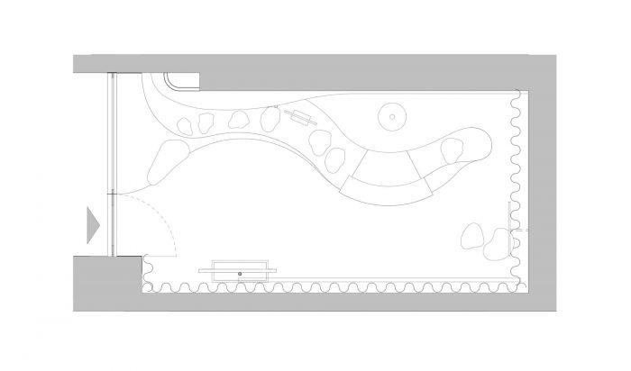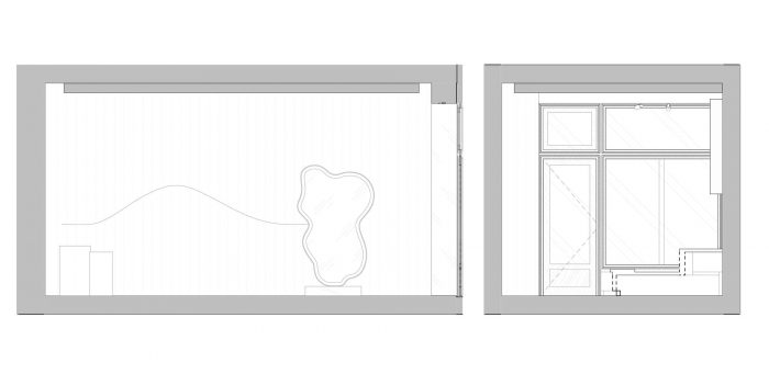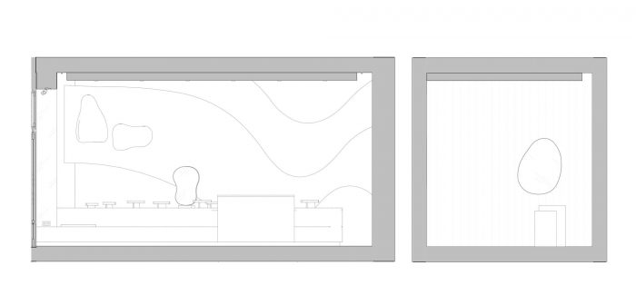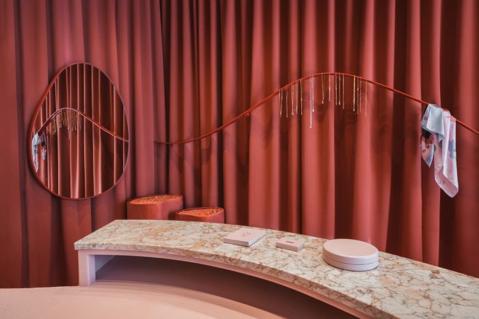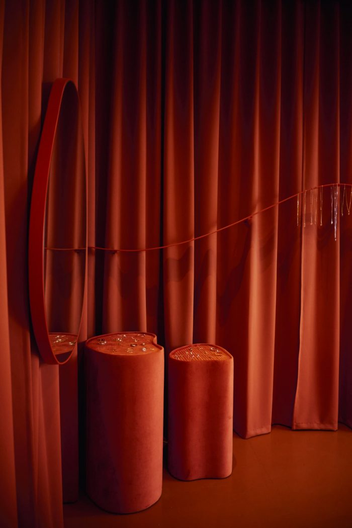 The wooden floor is oil finished to match the shade of the dark red ceiling. Illuminated with Molto Luce lamps, the ceiling resembles a starry night sky. The lamps, small in size but very bright, provide the best conditions for jewelry exposition. The mirrors alluding to the first KOPI’s collections inspired by the shape of a woman’s body will become a part of the brand’s permanent offer. The dais made of pink Sakura marble complements other details of the interior such as the counter and the trays, which exhibit the smallest elements of the jewelry.