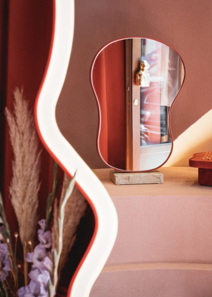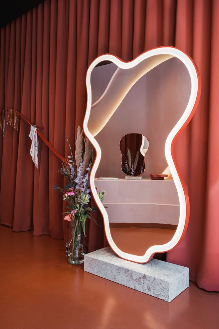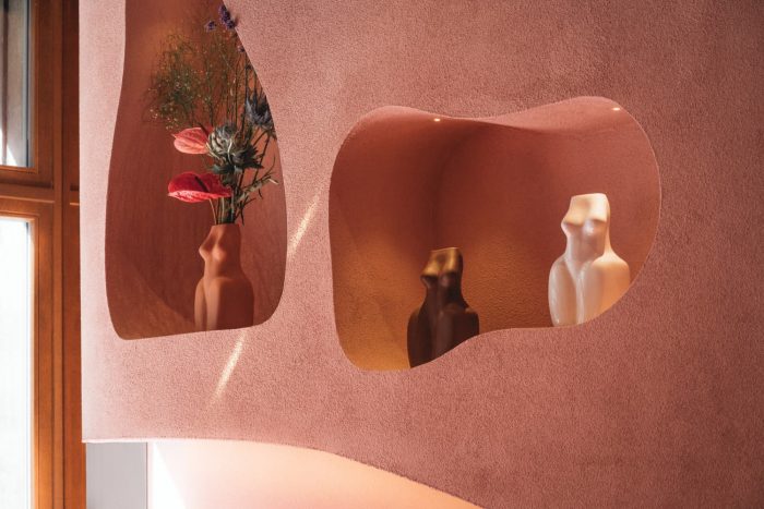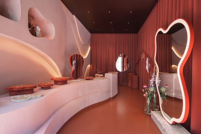 The characteristic storefront was designed in accordance with directives from the designs of the building from the 20s. Streamlined counter, dim Moroccan pink and terracotta along with a wall that looks like it was made of desert sand create a perfect background for the jewelry, making all of the KOPI collections shine. The desert-like atmosphere was achieved mainly through the placement of the wavy wall behind the counter which was made by artists with great attention to detail. It is covered with a thick coat of sand and painted with matte mineral paints. The characteristic recesses in the wall resemble cavities in rocks of the Atlas Mountains, making a perfect background for the organic forms of vases and candles.